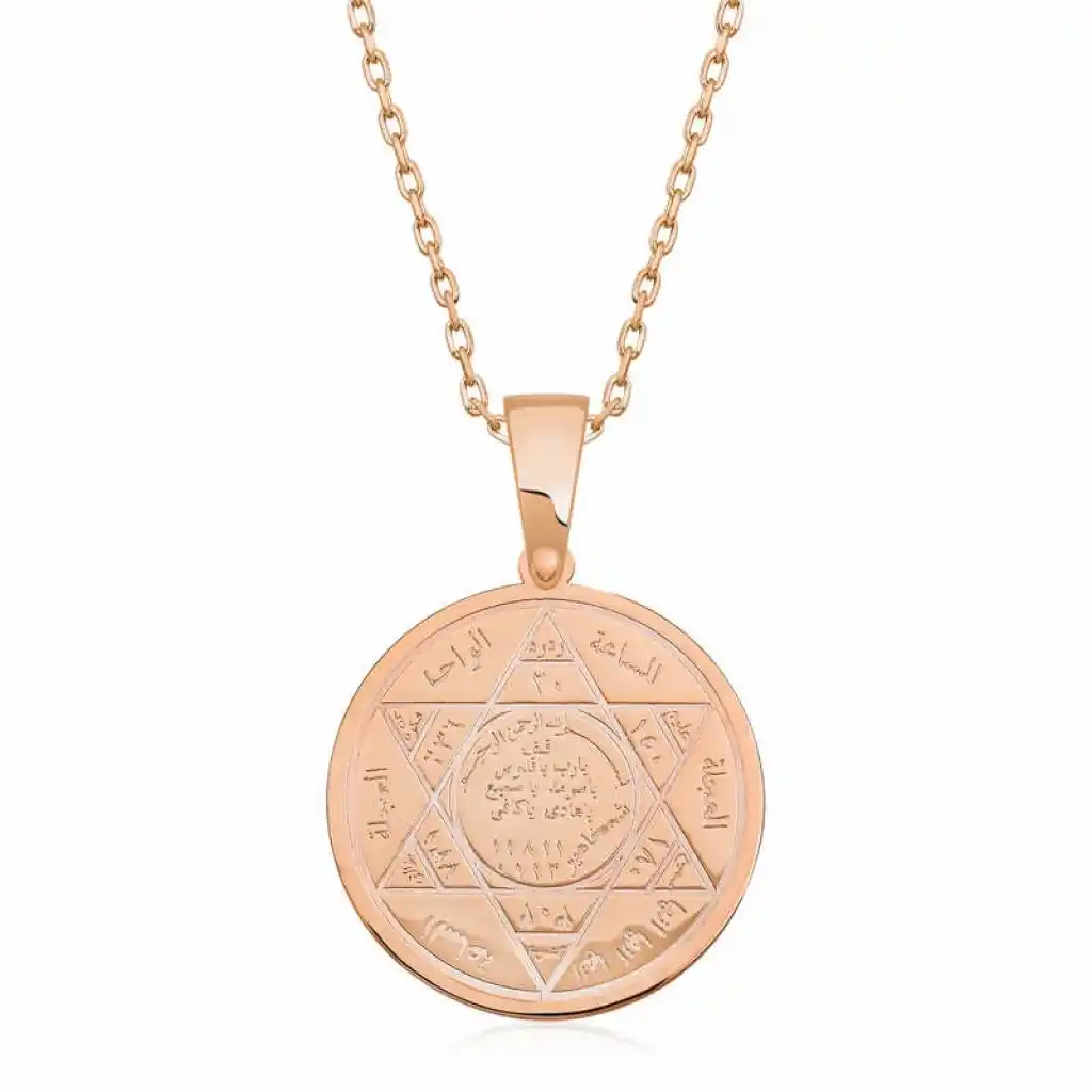 Davud yıldızı veya altı köşeli yıldız olarak da bilinen Süleyman mührünün hikmetlerini saymakla bitiremeyiz. Mührü yanında taşıyan kişiye büyü etki etmez. Kişiyi her türlü nazardan korunur. Taşıyan kişiye şeytan ve türevleri etki etmemesi gibi pek çok şifası vardır. Kolye 925 ayar gümüşten imal edilmiştir. Gümüş üzerine rose kaplama yapılmıştır. Rose kaplama yapılan gümüş kolyeler parlaklığını uzun süre muhafaza eder. Tüm gümüş bayan kolyelerde olduğu gibi gümüş Süleyman mührü kolye de el emeği ile üretilmiştir. Gümüş ve değerli taşlar nedeniyle belirtilen ortalama ürün ağırlığında ± %10 sapma olabilmektedir.