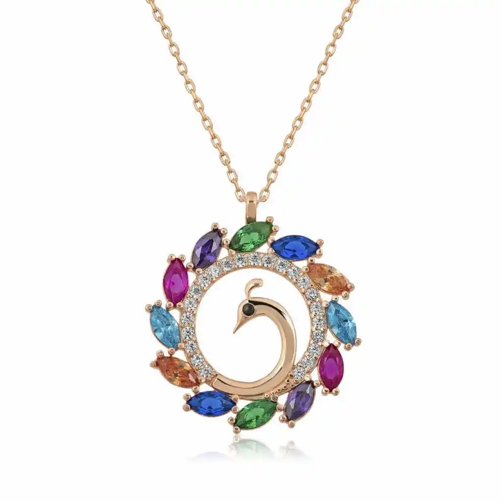 Tavus kuşu muhteşem güzellikteki desen ve renklere sahip kuyruğu ile ünlüdür. Tavus kuşlarının kuyruk tüylerindeki gözleri, bilgeliği simgelemektedir. Sizde kuyruk kısmında yer alan renk renk taşlardan oluşan bu şık kolyeyi severek kullanabilirsinz. Günün her anında size eşlik edecek ve kombinlerinizi tamamlayabileceğiniz tavus kuşu gümüş kolye, şıklığınıza şıklık katacak bir aksesuar olacaktır. Bu şık kolye; doğum günü hediyesi, sevgililer günü veya özel günlerde tercih edilebilecek mükemmel bir seçenektir. Kolye; 925 ayar gümüşten imal edilmiştir. Üzerindeki taşlar zirkondur. Gümüş üzerine rose altın kaplama yapılmıştır. Rose altın kaplama yapılan ürünler gümüşe pembe bakır rengi verir. Diğer kolyelerde olduğu gibi gümüş tavus kuşu kolye de el emeği ile üretilmiştir. Gümüş ve değerli taşlar nedeniyle belirtilen ortalama ürün ağırlığında ± %10 sapma olabilmektedir.