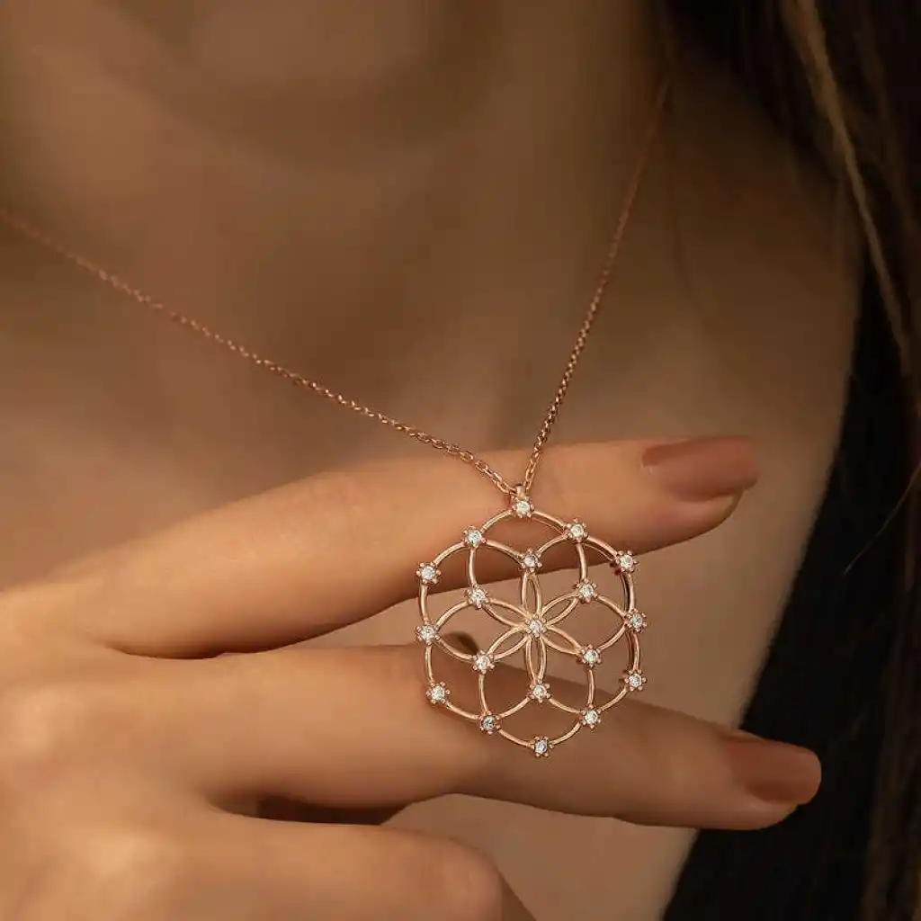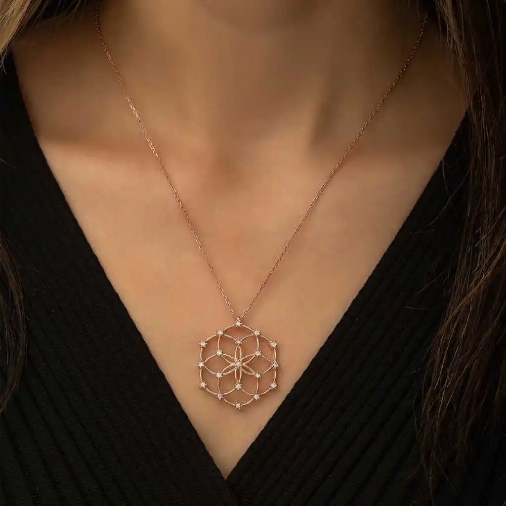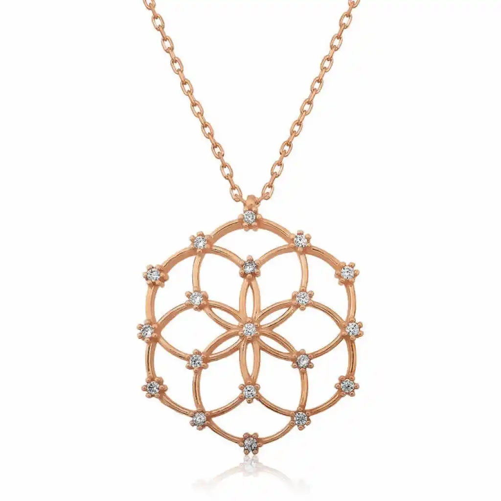 Yaşam çiçeği, iç içe geçmiş eşit alana sahip çok sayıda çember ve dışında büyük bir çemberden oluşan geometrik şekilden oluşmaktadır. Her bir çemberin merkezi, çevresindeki çemberin çevrelerinin kesiştiği yerdedir. Drunvalo Melchizedek bu sembolün evrenin ve yaşamın sırlarını barındırdığını iddia etmektedir. Günün her anında severek kullanabileceğiniz hoş bir aksesuardır. Gümüş yaşam çiçeği bayan kolye 925 ayar gümüşten imal edilmiştir. Bu kolye üzerine rose kaplama yapılmıştır.Rose kaplama yapılan ürünler parlaklığını uzun süre muhafaza eder ve gümüşü bakır rengine dönüştürür. Tüm gümüş bayan kolye modellerinde olduğu gibi gümüş yaşam çiçeği bayan kolye modeli de el emeği ile üretilmiştir. Gümüş ve değerli taşlar nedeniyle belirtilen ortalama ürün ağırlığında ± %10 sapma olabilmektedir. Ürünlerimizin tamamı el emeği ile üretilmiştir.