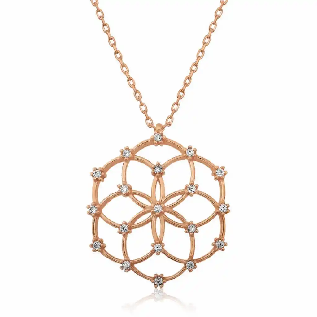 Yaşam çiçeği, iç içe geçmiş eşit alana sahip çok sayıda çember ve dışında büyük bir çemberden oluşan geometrik şekilden oluşmaktadır. Her bir çemberin merkezi, çevresindeki çemberin çevrelerinin kesiştiği yerdedir. Drunvalo Melchizedek bu sembolün evrenin ve yaşamın sırlarını barındırdığını iddia etmektedir. Günün her anında severek kullanabileceğiniz hoş bir aksesuardır. Gümüş yaşam çiçeği bayan kolye 925 ayar gümüşten imal edilmiştir. Bu kolye üzerine rose kaplama yapılmıştır.Rose kaplama yapılan ürünler parlaklığını uzun süre muhafaza eder ve gümüşü bakır rengine dönüştürür. Tüm gümüş bayan kolye modellerinde olduğu gibi gümüş yaşam çiçeği bayan kolye modeli de el emeği ile üretilmiştir. Gümüş ve değerli taşlar nedeniyle belirtilen ortalama ürün ağırlığında ± %10 sapma olabilmektedir. Ürünlerimizin tamamı el emeği ile üretilmiştir.
