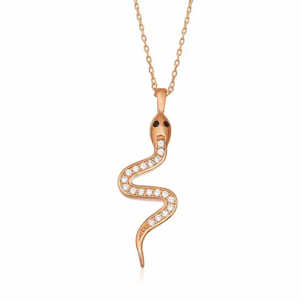 Yılan simgesinin bir çok yüzlülüğü vardır ama tüm simgeleri aynı düşünce etrafında gelişir. Ölümsüzdür çünkü yenilenir, yenilendiği için ayın gücüyle bağdaştırılır ve bununla bereket, bilgi ve ölümsüzlük dağıtır. Bir çok kültürde özellikle Hristiyanlıkta kutsal olarak kabul gören yılar hayatı ve hayatın gücünü temsil etmektedir. Sizde bu kolye ile gücü ve bilgeliği boynunuzda taşımaya ne dersiniz. Yılan bayan kolye 925 ayar gümüşten imal edilmiştir. Gümüş üzerine rose kaplama yapılmıştır. Rose kaplama yapılan gümüş kolye modelleri parlaklığını uzun süre muhafaza eder ve kararması gecikir. Gümüş zincirin uzunluğu 45 cm'dir. Tüm bayan kolye modellerinde olduğu gibi gümüş yılan bayan kolye de el emeği ile üretilmiştir. Gümüş ve değerli taşlar nedeniyle belirtilen ürün ürün ağırlığında ± %10 sapma olabilmektedir.