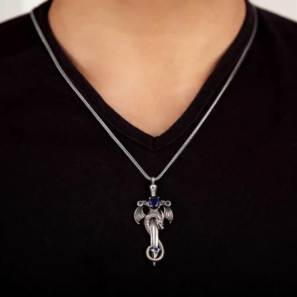Gümüş Safir Taşlı Ejderha Erkek Kılıç Kolye