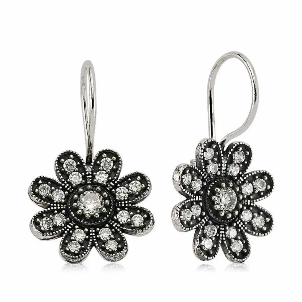 Işıl ışıl zirkon taşlarla süslenmiş bu şık ve modern küpe; göz alıcı çiçeklerle süslendi... Bu farklı tasarımı; doğum günü hediyesi, sevgililer günü hediyesi veya annelere hediye olarak özel günlerde tercih edebileceğiniz çok şık bir seçenektir. Küpe; 925 ayar gümüşten imal edilmiştir. Gümüş üzerine oksit kaplama yapılmıştır. Oksit kaplama yapılan gümüş küpeler parlaklığını uzun süre muhafaza eder, kararması gecikir. Tüm gümüş küpelerde olduğu gibi gümüş çiçek küpe modeli de el emeği ile üretilmiştir. Üzerinde bulunan taşlar zirkondur. Gümüş ve değerli taşlar nedeniyle belirtilen ortalama ürün ağırlığında ± %10 sapma olabilmektedir.