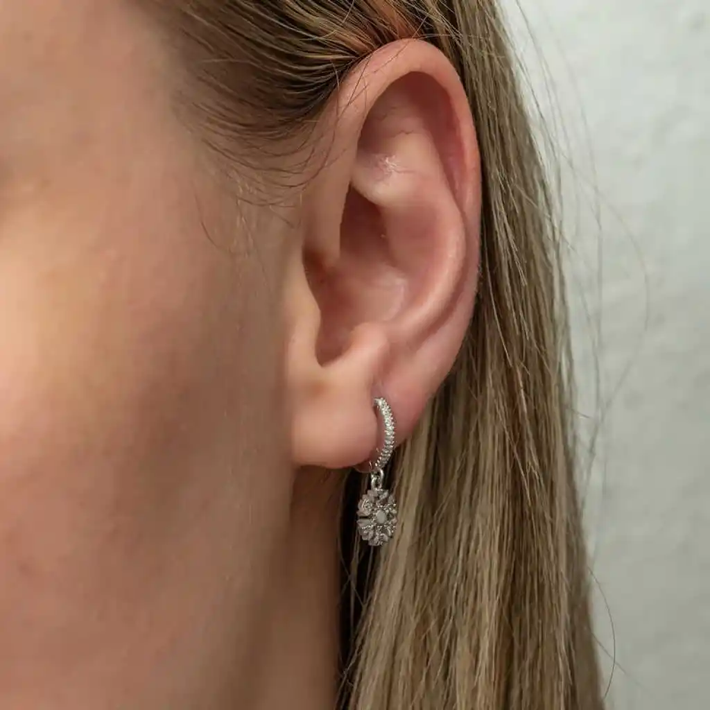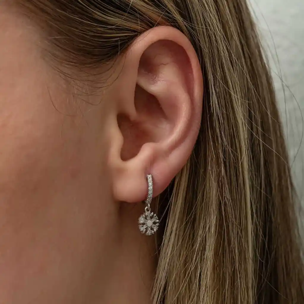 Kadınların ışıltısı, berraklığı kar tanesine benzetilip özel olarak tasarlanmıştır. Kar tanelerinin her birinin bayanlar gibi eşsiz ve ayrı kıymette olması onları özel kılan bir diğer özelliktir. Asilliği her dönemde dikkat çekmeyi başarmıştır. Bunun yanında insanların tıpkı kar taneleri gibi birbirlerine zarar vermeden de mutlu bir şekilde yaşayabileceklerini sembolize etmektedir. Bu şık küpe; 925 ayar gümüşten imal edilmiştir. Gümüş üzerine rodyum kaplama yapılmıştır. Rodyum kaplama yapılan gümüş küpeler parlaklığını uzun süre muhafaza eder,oksitlenmesi gecikir. Üzerinde bulunan taşlar zirkondur. Gümüş küpelerin tamamında olduğu gibi gümüş sallantılı kar tanesi bayan küpe de el emeği ile üretilmiştir. Gümüş ve değerli taşlar nedeniyle belirtilen ortalama ürün ağırlığında ± %10 sapma olabilmektedir.
