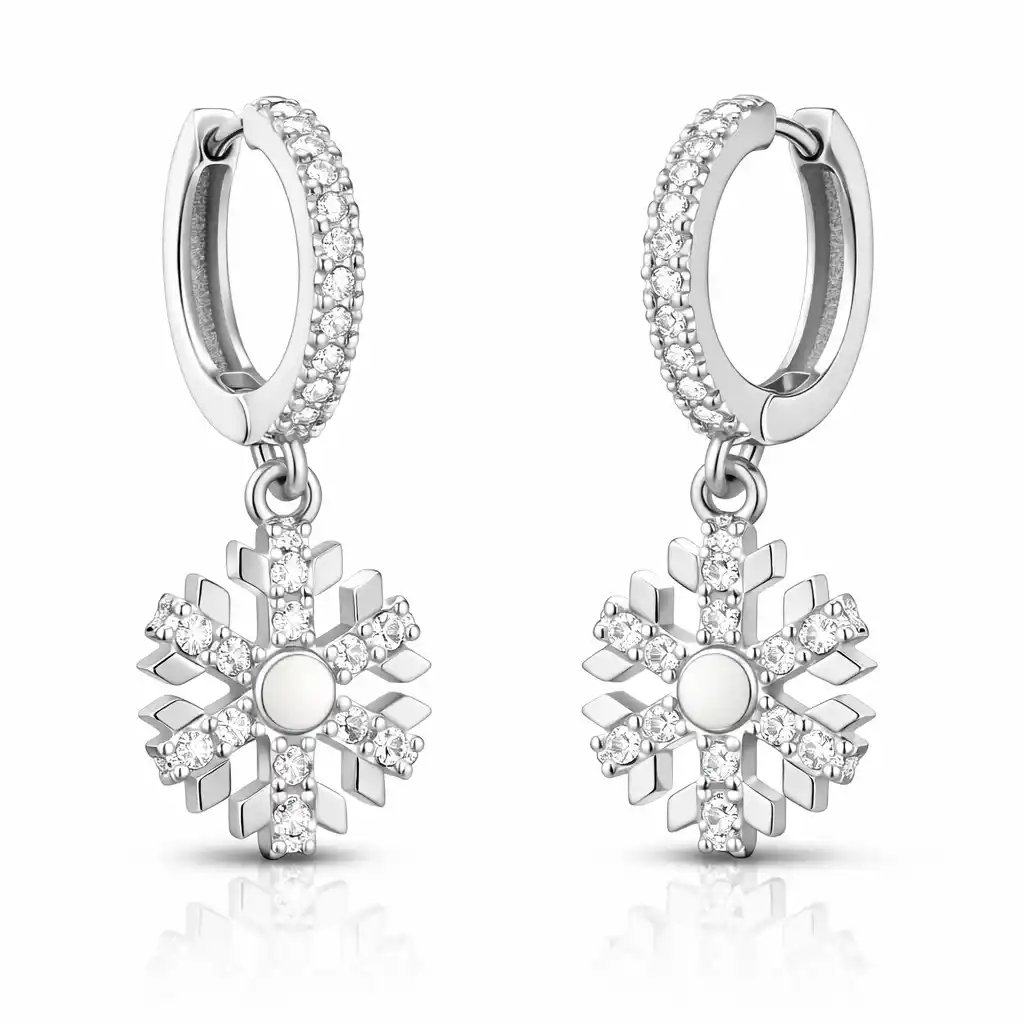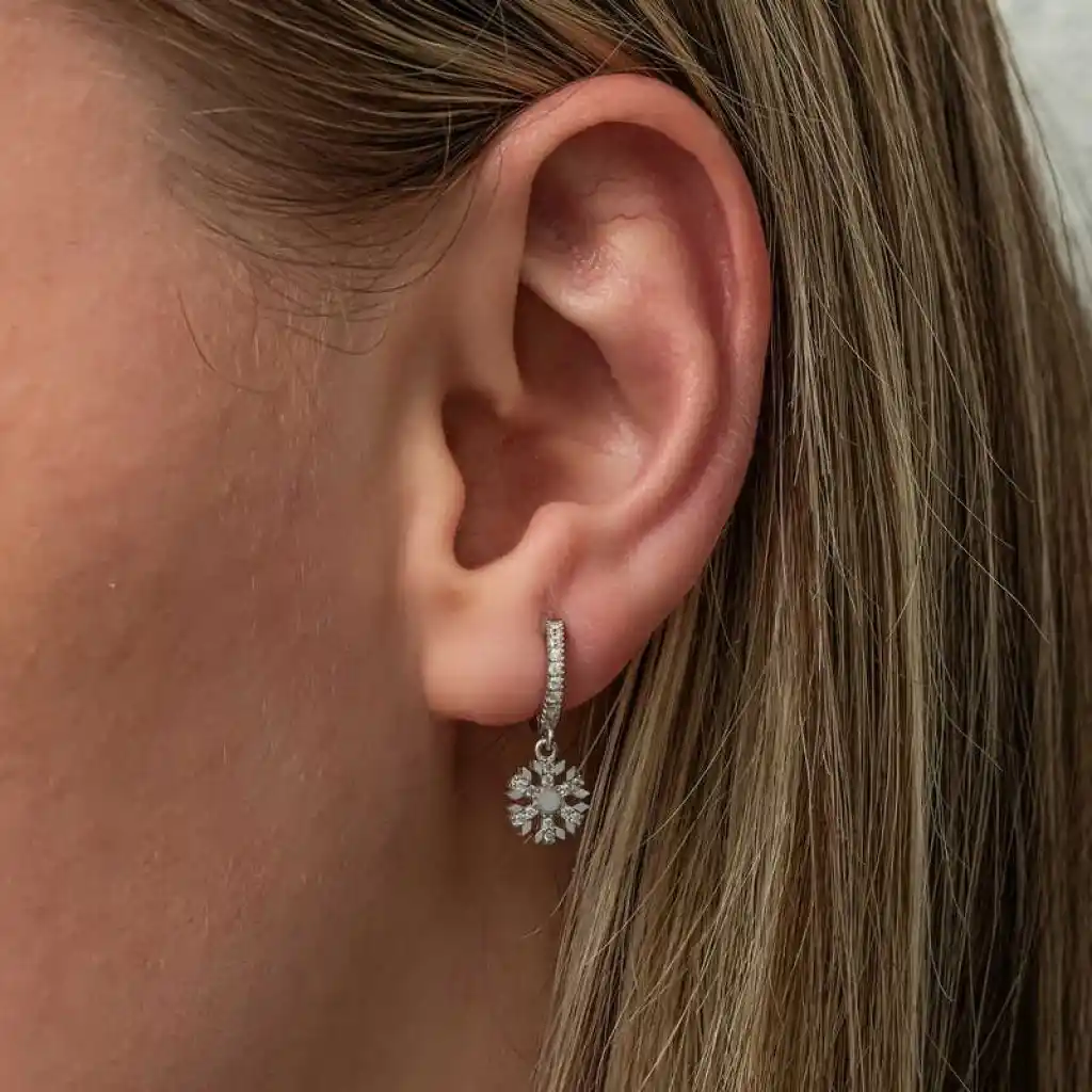 Kadınların ışıltısı, berraklığı kar tanesine benzetilip özel olarak tasarlanmıştır. Kar tanelerinin her birinin bayanlar gibi eşsiz ve ayrı kıymette olması onları özel kılan bir diğer özelliktir. Asilliği her dönemde dikkat çekmeyi başarmıştır. Bunun yanında insanların tıpkı kar taneleri gibi birbirlerine zarar vermeden de mutlu bir şekilde yaşayabileceklerini sembolize etmektedir. Bu şık küpe; 925 ayar gümüşten imal edilmiştir. Gümüş üzerine rodyum kaplama yapılmıştır. Rodyum kaplama yapılan gümüş küpeler parlaklığını uzun süre muhafaza eder,oksitlenmesi gecikir. Üzerinde bulunan taşlar zirkondur. Gümüş küpelerin tamamında olduğu gibi gümüş sallantılı kar tanesi bayan küpe de el emeği ile üretilmiştir. Gümüş ve değerli taşlar nedeniyle belirtilen ortalama ürün ağırlığında ± %10 sapma olabilmektedir.
