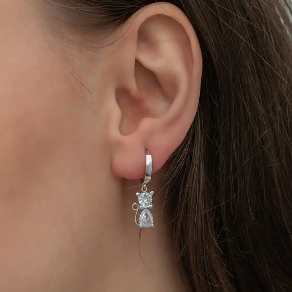 Dünya tatlısı sıcacık sevimli dostlarımız kedileri sizler için tasarladık. Bu ışıl ışıl ve farklı tasarımıyla bu şık küpe modeli 925 ayar gümüşten imal edilmiştir . Gümüş üzerine rodyum kaplama yapılmıştır. Rodyum kaplama yapılan gümüş küpeler parlaklığını uzun süre muhafaza eder, oksitlenmesi gecikir. Gümüş sallantılı kedi kadın küpenin üzerinde bulunan taş zirkondur. Tüm gümüş kadın küpelerinde olduğu gibi gümüş sallantılı kedi kadın küpesinin de tamamı el emeği ile üretilmiştir. Gümüş ve değerli taşlar nedeniyle belirtilen ortalama ürün ağırlığında ± %10 sapma olabilmektedir.