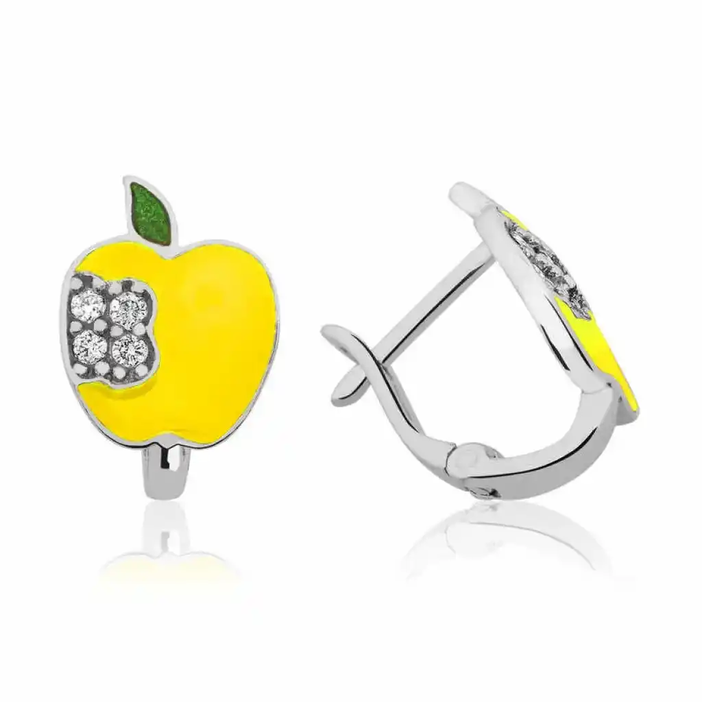 En kıymetlileriniz, bebekleriniz, çocuklarınız için hazırlanan, sevimli figürlerle tasarlanan birbirinden zarif ve renkli bebek ve çocuk küpeleri ile ömür boyu saklanabilecek, anlamlı bir hediye seçebilirsiniz. Sarı elma figürlü çocuk küpesi 925 ayar gümüşten imal edilmiştir. Gümüş üzerine rodyum kaplama yapılmıştır. Rodyum kaplama yapılan gümüş çocuk küpeleri parlaklığını uzun süre muhafaza eder ve oksitlenmesi gecikir. Küpe üzerinde bulunan taşlar zirkon"dur. Tüm çocuk küpe modelleri el emeği ile üretilmiştir. Gümüş ve değerli taşlar nedeniyle belirtilen ortalama ürün ağırlığında ± %10 sapma olabilmektedir.