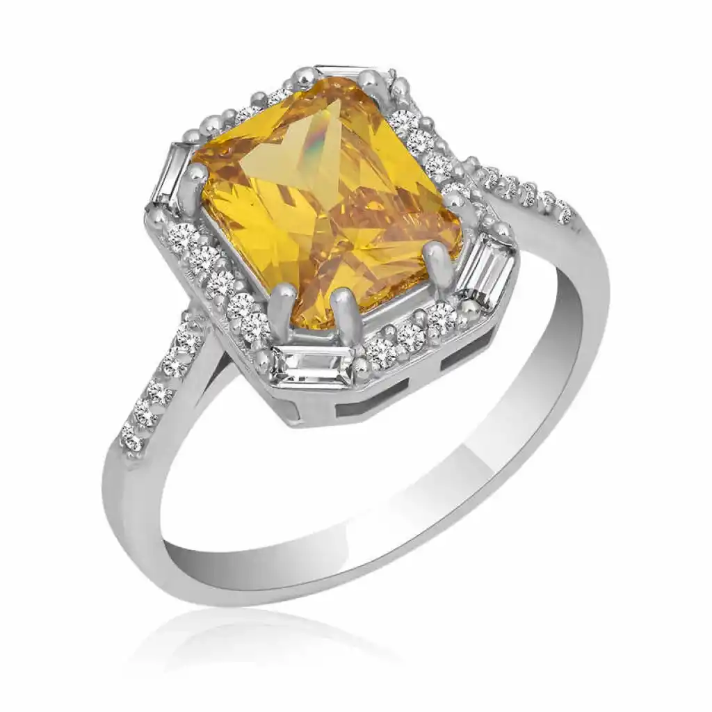 Günlük hayatta rahatlıkla kullanabileceğiniz bu özel tasarım sarı baget kare yüzük 925 ayar gümüşten imal edilmiştir. Gümüş üzerine rodyum kaplama yapılmıştır. Rodyum kaplama yapılan kadın gümüş yüzük modelleri parlaklığını uzun süre muhafaza eder, oksitlenmesi gecikir. Yüzük üzerinde bulunan taşlar zirkondur. Sevdiğinize doğum günü, sevgililer günü ve özel günlerde tercih edebileceğiniz mükemmel bir hediye seçeneğidir. Gümüş kadın yüzük modellerimizin tamamında olduğu gibi bu baget kesim kadın yüzük de tamamen el emeği ile üretilmiştir. Gümüş ve değerli taşlar nedeniyle belirtilen ortalama ürün ağırlığında ± %10 sapma olabilmektedir.