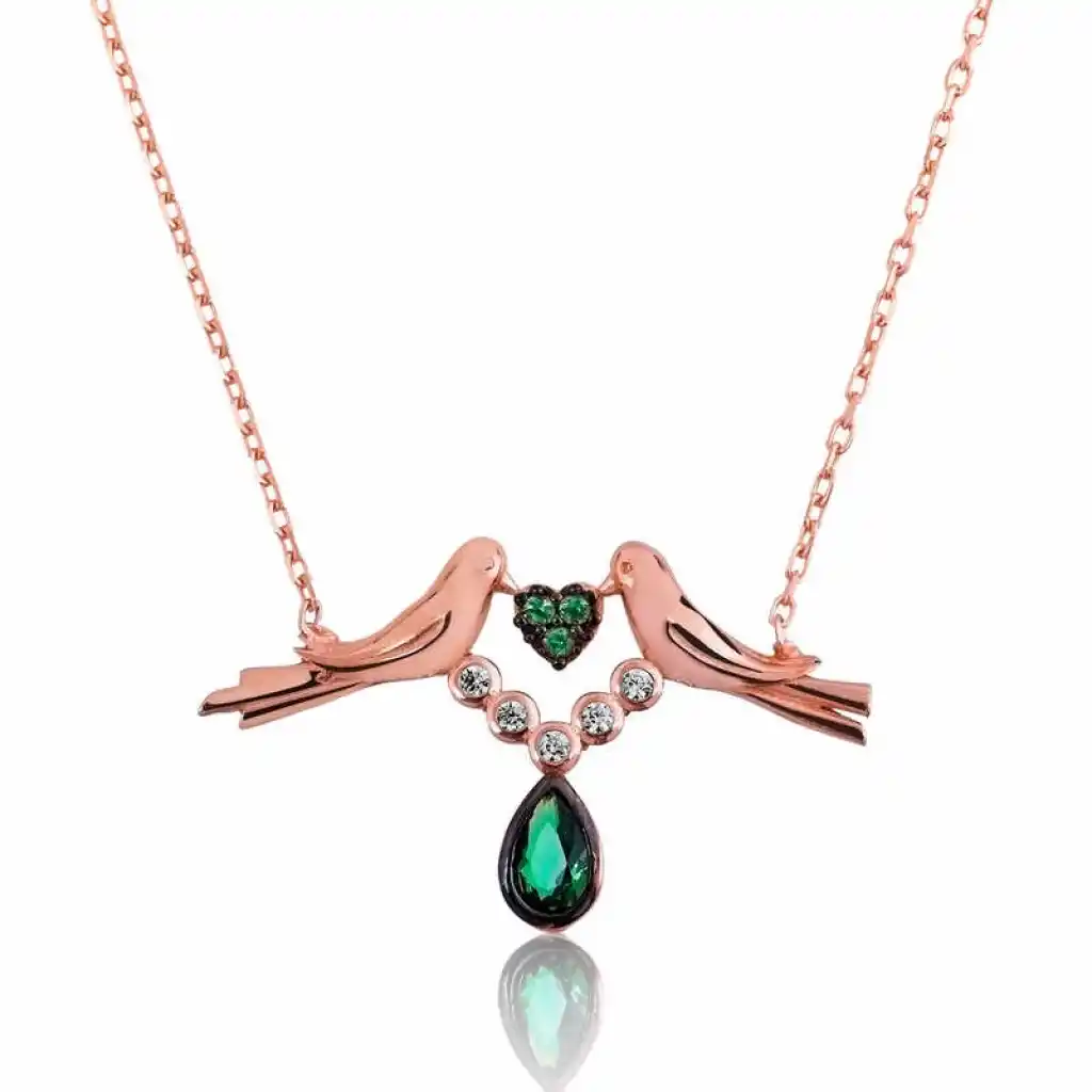 Kalp deseniyle aşkı ifade eden bu kolye ile sevginiz, sevdiğiniz kadının teninde hayat bulsun. Aşık kuşların bağlılıklarını anlatan bu şık kolye; 925 ayar gümüşten imal edilmiştir. Gümüş üzerine rose altın kaplama yapılmıştır. Rose altın kaplama yapılan gümüş kolyeler parlaklığını uzun süre muhafaza eder ve oksitlenmesi gecikir. Kolye üzerinde bulunan taşlar zirkondur. Gümüş olan zincir boyu ortalama 45 cm"dir. Tüm bayan kolyelerde olduğu gibi gümüş sevgi kuşu bayan kolye modeli de el emeği ile üretilmiştir. Gümüş ve değerli taşlar nedeniyle belirtilen ortalama ürün ağırlığında ± %10 sapma olabilmektedir.