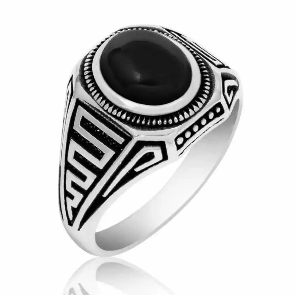 Gümüş üzerindeki siyah oniks taşından oluşan bu yüzük modeli günün her anında kullanabileceğiniz şık bir aksesuardır. Bu yüzüğü; kendinize ya da sevdiklerinize doğum gününde, babalar gününde veya özel günlerde hediye edebilirsiniz. Siyah taşlı erkek yüzük modeli 925 ayar gümüşten imal edilmiştir. Gümüş üzerine oksit kaplama yapılmıştır. Oksit kaplama yapılan gümüş erkek yüzük modelleri parlaklığını uzun süre muhafaza eder. Yüzük üzerindeki siyah taş onikstir. Tüm erkek yüzüklerde olduğu gibi gümüş siyah taşlı erkek yüzük modeli de el emeği ile üretilmiştir. Gümüş ve değerli taşlar nedeniyle belirtilen ortalama ürün ağırlığında ± %10 sapma olabilmektedir.