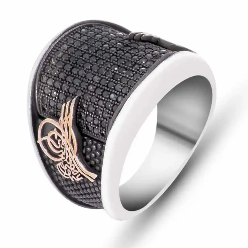 Tuğra, Osmanlı sultanlarının imzası anlamına gelir. Her tuğra; ona ait olan padişahın ismini, varlığını, hükümdarlığını ifade eder. Tuğra sembolü her padişaha göre farklı olmak üzere birçok şekilde günümüze ulaşmıştır. Tuğra Osmanlının her döneminde korunmuş, önemini hiç kaybetmemiştir. Ve zamanla hat sanatımızda da önemli bir yere sahip olup, günümüzde hattatlar tarafından sanatsal olarak yaşatılmaktadır. Bu sanatı yansıtan gümüş yüzüğü severek kullanabilir ve sevdiklerinize hediye edebilirsiniz. Tuğralı erkek yüzük; 925 ayar gümüşten imal edilmiştir. Tuğralı yüzük, gümüş üzerine oksit kaplama yapılmıştır. Yüzük üzerinde bulunan siyah taş zirkondur. Tüm gümüş erkek yüzüklerinde olduğu gibi gümüş siyah taşlı tuğralı erkek yüzük de tamamı el emeği ile üretilmiştir. Gümüş ve değerli taşlar nedeniyle belirtilen ortalama ürün ağırlığında ± %10 sapma olabilmektedir.