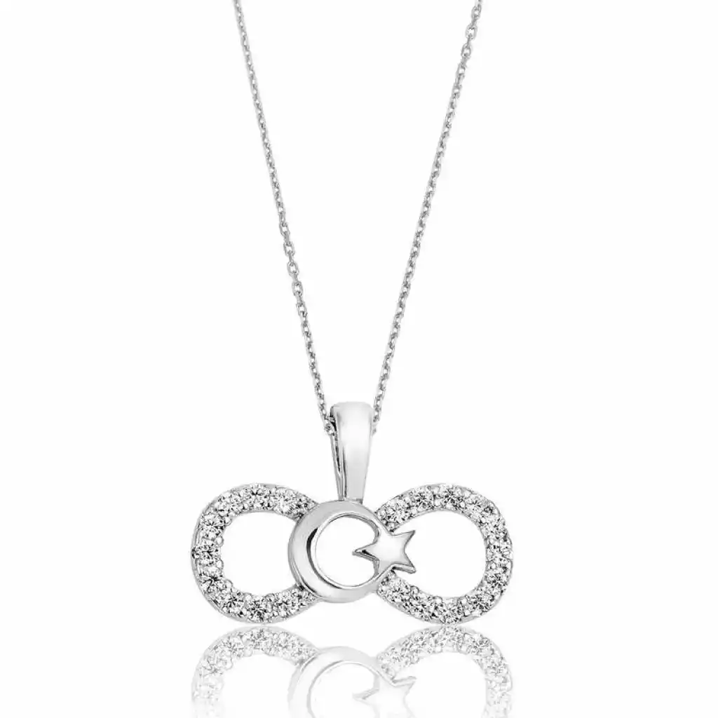 Sevgilinize sonsuz aşkı ifade etmenin en güzel en anlamlı yollarından biri de tabikide sonsuzluk kolyedir. Sevgilinize hediye edeceğiniz bu özel ay yıldız desenli gümüş kolye modeli ile ona olan sonsuz aşkınızı sevginizi ifade edebilir sonsuza kadar birlikte olacağınız mesajı verebilirsiniz. Bu şık kolye 925 ayar gümüşten imal edilmiştir. Gümüş üzerine rodyum kaplama yapılmıştır. Rodyum kaplama yapılan gümüş kolye modelleri parlaklığını uzun süre muhafaza eder. Gümüş olan zincir uzunluğu 45 cm"dir. Ürünlerimizin tamamı el emeği ile üretilmiştir. Gümüş ve değerli taşlar nedeniyle belirtilen ortalama ürün ağırlığında ± %10 sapma olabilmektedir.
