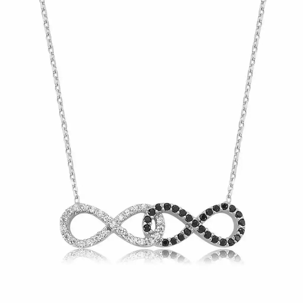 Sevgilinize sonsuz aşkı ifade etmenin en güzel en anlamlı yollarından biri ona sonsuzluk temalı kolyeler hediye etmektir. Sevgilinize hediye edeceğiniz bu özel tasarım gümüş kolye ile ona olan sonsuz aşkınızı ve sevginizi ifade edebilir, sonsuza kadar birlikte olacağınız mesajı verebilirsiniz. Bu sonsuzluk bayan kolye modeli 925 ayar gümüşten imal edilmiştir. Gümüş üzerine rodyum kaplama yapılmıştır. Rodyum kaplama yapılan gümüş bayan kolye modelleri parlaklığını uzun süre muhafaza eder ve oksitlenmesi gecikir. Kolye üzerinde bulunan taşlar zirkondur. Tamamı gümüş olan zincirin boyu ortalama 45 cm"dir. Tüm gümüş bayan kolye modellerinde olduğu gibi gümüş sonsuzluk bayan kolye modeli de el emeği ile üretilmiştir. Gümüş ve değerli taşlar nedeniyle belirtilen ürün ağırlığında ± %10 sapma olabilmektedir.