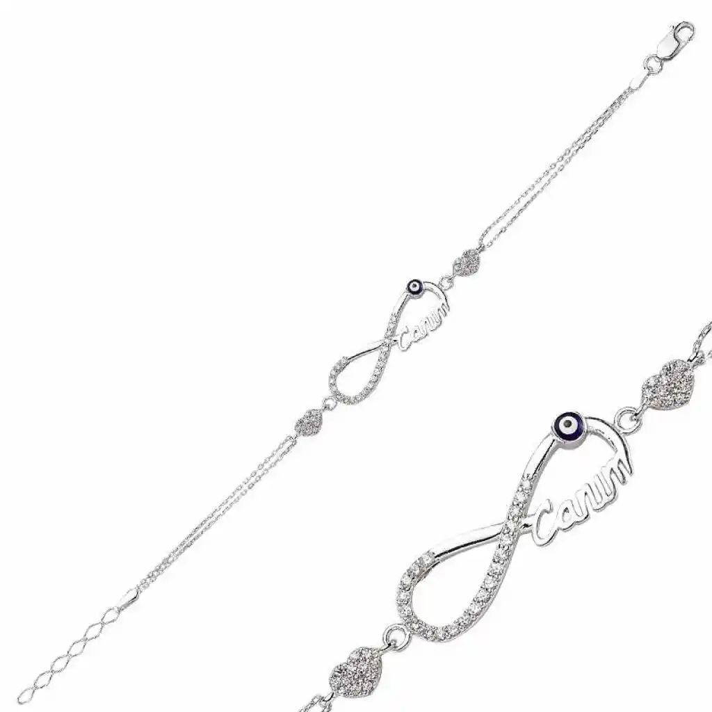 Sevgilinize sonsuz aşkı ifade etmenin en güzel, en anlamlı yollarından biri tabi ki sonsuzluk sembolüdür... Sevgilinize hediye edeceğiniz bu anlamlı gümüş bileklik ile ona olan sonsuz aşkınızı ve sevginizi ifade edebilir sonsuza kadar birlikte olacağınız mesajı verebilirsiniz. Sonsuzluk canım bileklik 925 ayar gümüşten imal edilmiştir. Gümüş üzerine rodyum kaplama yapılmıştır. Rodyum kaplama yapılan ürünler parlaklığını uzun süre muhafaza eder, oksitlenmesi gecikir. Gümüş sonsuzluk canım bayan bileklik üzerinde bulunan taşlar zirkondur. Tüm bayan bilekliklerde olduğu gibi gümüş sonsuzluk canım bayan bilekliğin tamamı da el emeği ile üretilmiştir. Gümüş ve değerli taşlar nedeniyle belirtilen ortalama ürün ağırlığında ± %10 sapma olabilmektedir.