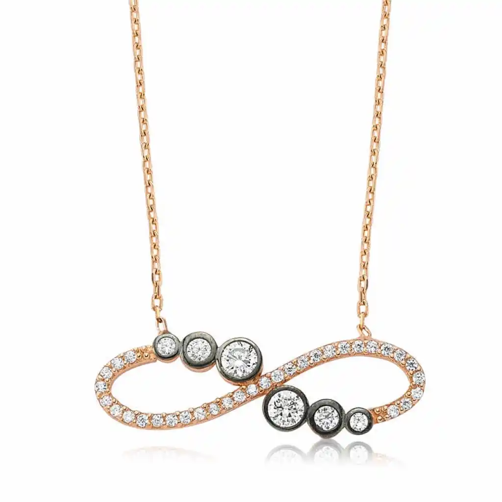 Sevgilinize sonsuz aşkı ifade etmenin en güzel en anlamlı yollarından biri de ona sonsuzluk temalı gümüş kolye hediye etmektir. Sevgilinize hediye edeceğiniz bu özel kolye ile ona olan sonsuz aşkınızı sevginizi ifade edebilir sonsuza kadar birlikte olacağınız mesajı verebilirsiniz. Gümüş süzme suyolu sonsuzluk bayan kolye 925 ayar gümüşten imal edilmiştir. Gümüş üzerine rose altın kaplama yapılmıştır. Rose altın kaplama yapılan gümüş bayan sonsuzluk kolye modelleri parlaklığını uzun süre muhafaza eder ve oksitlenmesi gecikir. Kolye üzerinde bulunan taşlar zirkondur. Gümüş olan zincir boyu ortalama 45 cm"dir. Tüm bayan kolye modellerinde olduğu gibi gümüş süzme suyolu sonsuzluk bayan kolye de el emeği ile üretilmiştir. Gümüş ve değerli taşlar nedeniyle belirtilen ürün ağırlığında ± %10 sapma olabilmektedir.