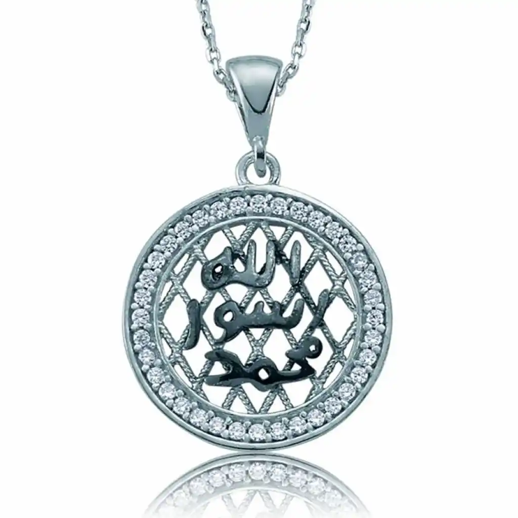 Mühür kelime manasıyla aslen ""yüzük"" anlamına gelir. Öyle ki Resulullah"ın mührü aynı zamanda yüzük şeklindeydi. Hz. Muhammed (s.a.v.) Mühr-ü Şeriflerde , üç satır halinde, “Muhammed Resulullah" ibaresi kazınmıştı. Birinci satırda “Muhammed”, ikinci satırda “Resul”, üçüncü satırda da “Allah” kelimeleri yer alıyordu. Sizler de sevdiklerinize bu manevi değeri yüksek gümüş bayan kolyeyi hediye edebilir onları sevindirebilirsiniz. Taşlı Mühr-ü Şerif bayan kolye 925 ayar gümüşten imal edilmiştir. Kolye üzerinde bulunan taşlar zirkondur. Taşlı Mühr-ü Şerif Bayan Kolye gümüş üzerine oksit kaplama yapılmıştır. Gümüş bayan kolye modellerimizin tamamı el emeği ile üretilmiştir. Gümüş ve değerli taşlar nedeniyle ürün ağırlığında ± %10 sapma olabilmektedir.