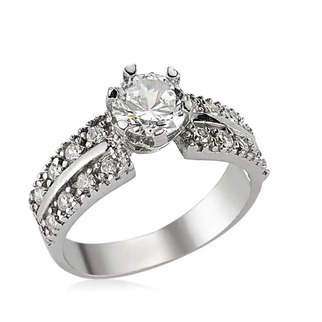 Klasik tek taş modellerinin güzel bir örneği olan bu model tüm bayan yüzük modelleri arasında dikkat çekici tasarımıyla ön plana çıkıyor. 925 ayar gümüşten imal edilmiş olup, yüzük üzerine rodyum kaplama yapılmıştır. Rodyum kaplama yapılan gümüş yüzük modelleri parlaklığını uzun süre muhafaza eder, oksitlenmesi gecikir. Yüzük üzerinde kullanılan beyaz taş zirkondur. Zirkon pırlanta benzeri bir taştır. Görüntü itibariyle pırlantaya benzer ama gerçek değildir. Genelde gümüş bayan tek taş yüzük modellerinde zirkon taş kullanılır. Bayan tek taş yüzük modellerinin tamamı el emeği ile üretilmiştir. Gümüş ve değerli taşlar nedeniyle belirtilen ortalama ürün ağırlığında ± %10 sapma olabilmektedir.