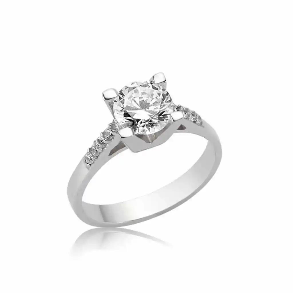 Klasik tek taş modellerinin güzel bir örneği olan bu model tüm bayan yüzük modelleri arasında dikkat çekici tasarımıyla ön plana çıkıyor. 925 ayar gümüşten imal edilmiş olup, yüzük üzerine rodyum kaplama yapılmıştır. Rodyum kaplama yapılan gümüş yüzük modelleri parlaklığını uzun süre muhafaza eder, oksitlenmesi gecikir. Yüzük üzerinde kullanılan beyaz taş zirkondur. Zirkon pırlanta benzeri bir taştır. Görüntü itibariyle pırlantaya benzer ama gerçek değildir. Genelde gümüş bayan tek taş yüzük modellerinde zirkon taş kullanılır. Bayan tek taş yüzük modellerinin tamamı el emeği ile üretilmiştir. Gümüş ve değerli taşlar nedeniyle belirtilen ortalama ürün ağırlığında ± %10 sapma olabilmektedir.
