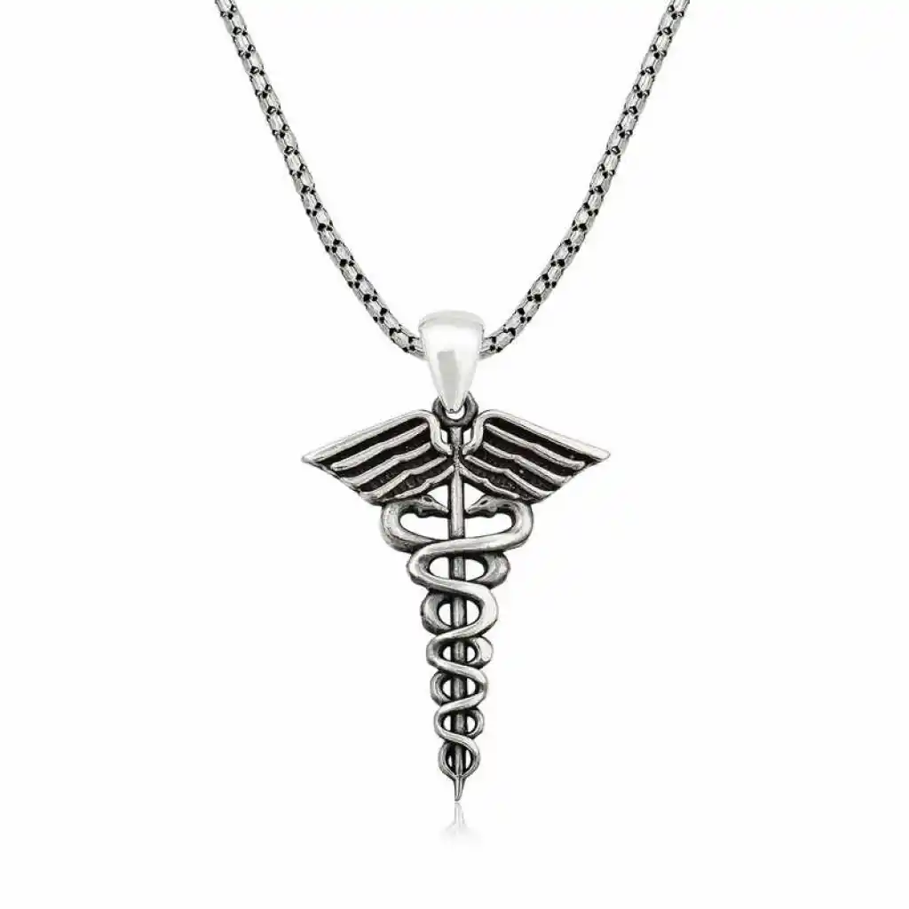 Yunan mitolojisindeki haberci İlâh Hermes"in (Roma mitolojisinde Merkür), tepesinde iki kanadın ve çevresinde birbirine dolanmış iki yılanın yer aldığı asa sembolü. Hermes"in Kadüse adlı çift yılanlı asasına dolanmış tıbbın sembolü olarak şifa ile zehrin zıt güçleri ve yeniden dirilişin betimlenişi görülür, ateş çıkarma, insanları derin uykuya daldırma, uyuşturma, rüyalar vs. iletebilen, uzlaştırma gücüne sahip olduğuna inanılan asadır. Zaman ve kader çarkını anlatır. Bu şık tasarımıyla göz kamaştıran kolye; 925 ayar gümüşten imal edilmiştir. Gümüş üzerine oksit kaplama yapılmıştır. Oksit kaplama yapılan ürünler siyah eskitme görünüme sahip olur. Tüm gümüş kolyelerde olduğu gibi bu kolye de tamamı el emeği ile üretilmiştir. Gümüş ve değerli taşlar nedeniyle ürün ağırlığında ± %10 sapma olabilmektedir.
