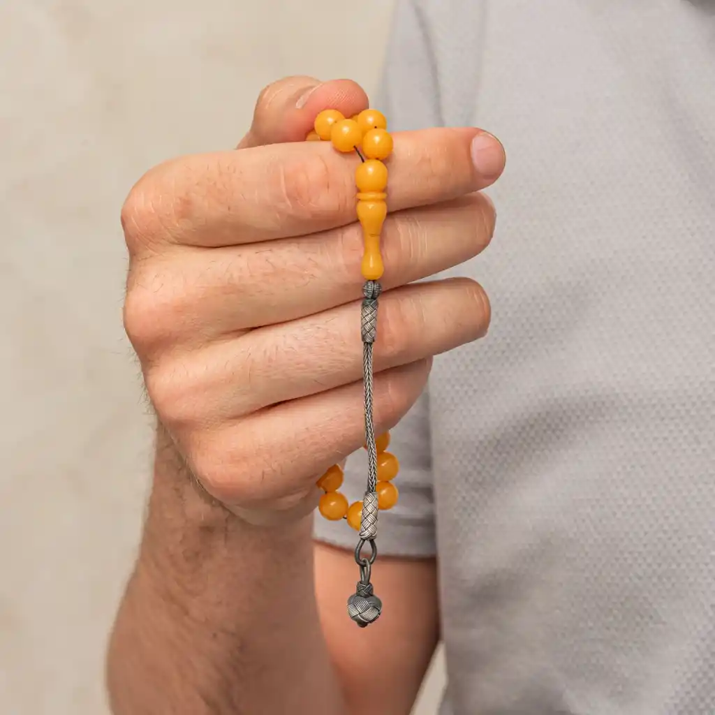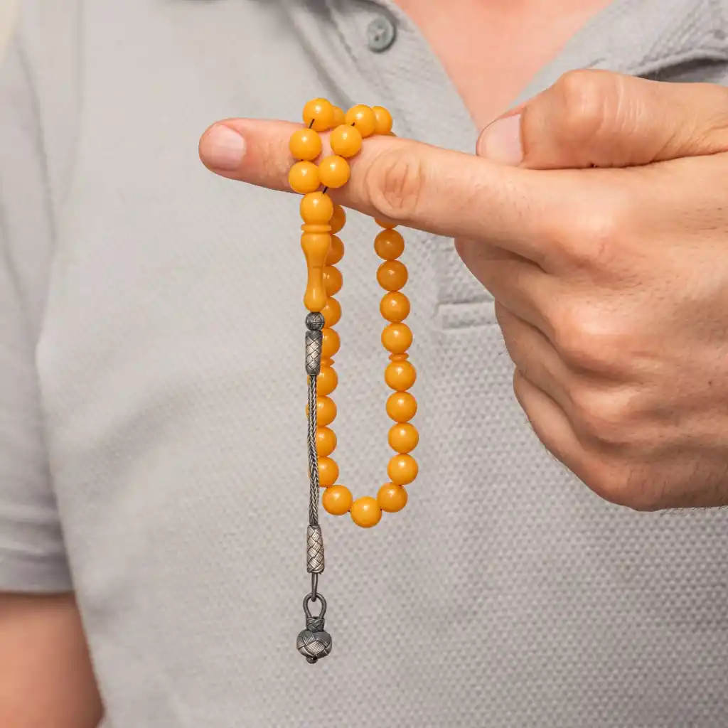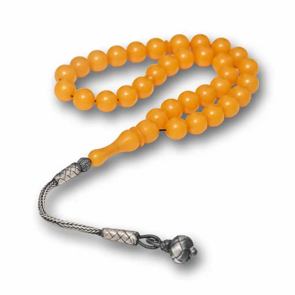 Bu özel tesbih, yuvarlak kesim sarı sıkma kehribar taneleri ve el işçiliği gümüş top kazaz püskülüyle tasarlanmıştır. Her bir tanesi özenle işlenmiş olup, doğal kehribarın sıcak ve canlı sarı tonu tesbihe ayrı bir zarafet katmaktadır. Yuvarlak kesim taneler, pürüzsüz bir dokunuş ve akıcı bir çekim deneyimi sunarken, gümüş top kazaz püskül hem estetik hem de dayanıklı bir detay olarak öne çıkar. Günlük kullanımda rahatlık sağlar, özel koleksiyonlarda ise değerini korur. Sevdiklerinize anlamlı bir hediye veya kendiniz için şık ve sofistike bir aksesuar olarak tercih edebileceğiniz zamansız bir tesbihdir. Gümüş ve değerli taşlar nedeniyle belirtilen ürün ağırlığında ± %10 sapma olabilmektedir.