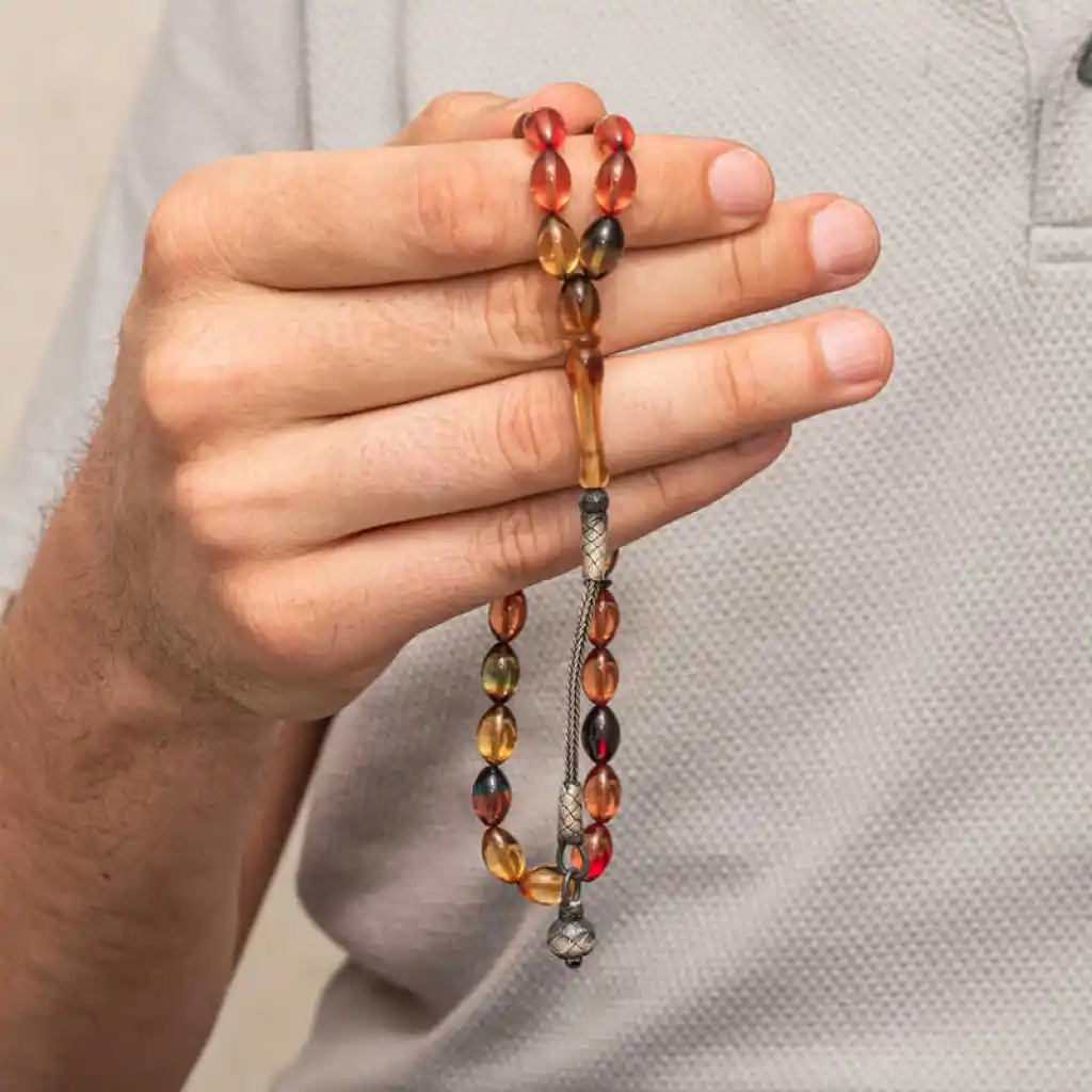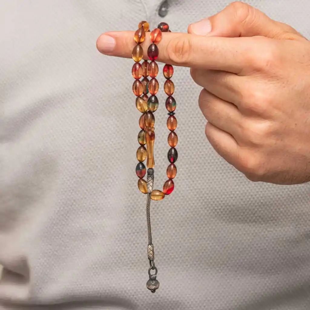 Gümüş Top Kazaz Püsküllü Sıkma Kehribar Tesbih