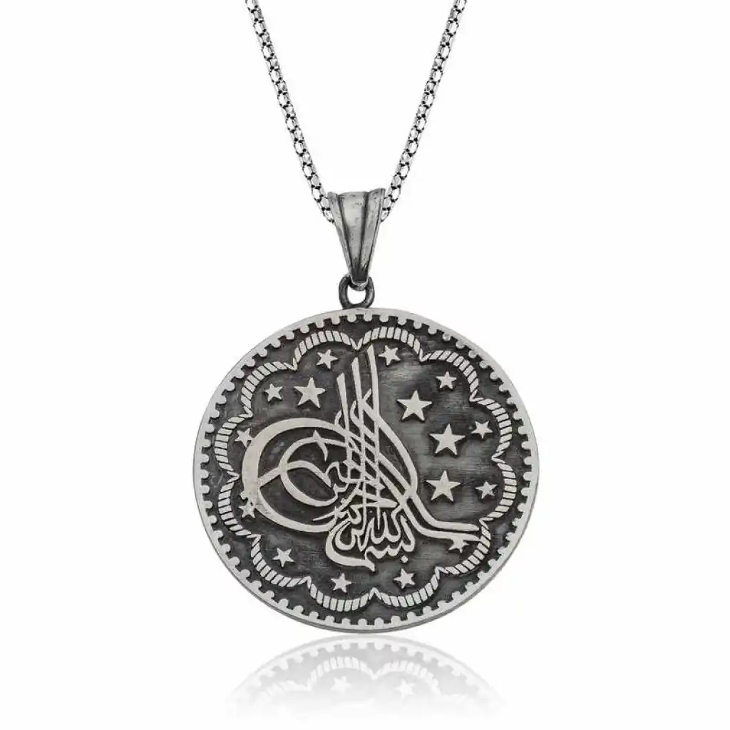 Tuğra, Osmanlı sultanlarının imzası anlamına gelir. Her tuğra; ona ait olan padişahın ismini, varlığını, hükümdarlığını ifade eder. Tuğra sembolü her padişaha göre farklı olmak üzere birçok şekilde günümüze ulaşmıştır. Tuğra Osmanlının her döneminde korunmuş, önemini hiç kaybetmemiştir. Ve zamanla hat sanatımızda da önemli bir yere sahip olup, günümüzde hattatlar tarafından sanatsal olarak yaşatılmaktadır. Bu sanatı yansıtan tuğralı şık gümüş kolyeyi severek kullanabilir doğum günü, sevgililer günü veya özel günlerde hediye olarak tercih edebilirsiniz. Tuğra kolye modeli 925 ayar gümüşten imal edilmiştir. Gümüş üzerine oksit kaplama yapılmıştır. Zincir boyu ortalama 55 cm"dir. Tüm gümüş kolye modellerinde olduğu gibi bu gümüş tuğra kolye modeli de tamamı el emeği ile üretilmiştir. Gümüş nedeniyle belirtilen ortalama ürün ağırlığında ± %10 sapma olabilmektedir.