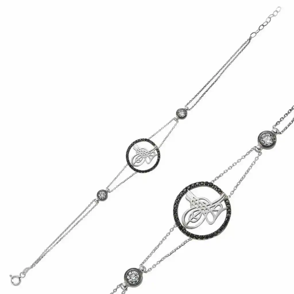 Osmanlı devleti padişahlarının imzası olan tuğra modeli bu özel tasarım bayan bileklik modeline işlenmiştir. 925 ayar gümüşten imal edilmiştir. Bileklik üzerindeki siyah ve bayaz taşlar zirkondur. Bu bileklik üzerine rodyum kaplama yapılmıştır. Rodyum kaplama yapılan gümüş bileklik modelleri parlaklığını uzun süre muhafaza eder. Uzatma zinciri sayesinde her bilek kalınlıklarına göre ayarlanabilir. Tüm bayan bileklik modellerimizde olduğu gibi tuğralı bayan bileklik modelimiz de tamamen el emeği ile üretilmiştir. Gümüş ve değerli taşlar nedeniyle belirtilen ortalama ürün ağırlığında ± %10 sapma olabilmektedir.