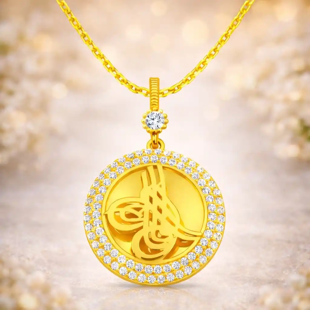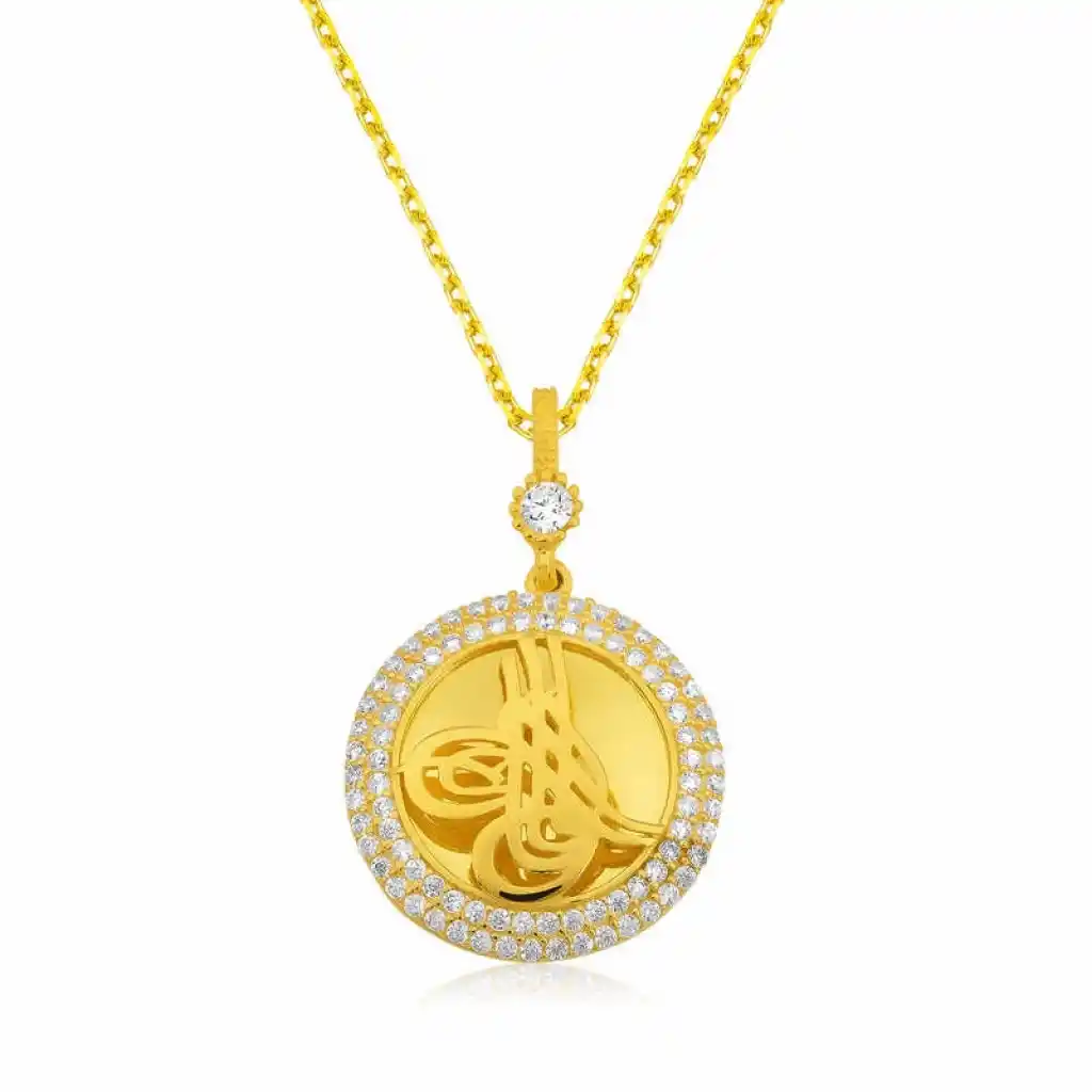 Osmanlı Devleti ve İmparatorluğu"ndaki padişahların imza olarak da kullandığı tuğra sembolü gümüş ile birleşerek anlamlı bir kolye haline gelmiştir. Böylelikle sevdiklerinizi veya kendinizi dini ve derin bir anlama sahip olan bu gümüş Tuğra armalı bayan kolye ile sevindirebilirsiniz. Kolye 925 ayar gümüşten imal edilmiştir. Gümüş üzerine altın kaplama yapılmıştır. Altın kaplama yapılan gümüş bayan kolye modelleri parlaklığını uzun süre muhafaza eder, gümüşe altın rengini verir. Kolye üzerinde bulunan taşlar zirkondur. Zincir uzunluğu ortalama 50 cm"dir. Ürünlerimizin tamamı el emeği ile üretilmiştir. Gümüş ve değerli taşlar nedeniyle belirtilen ortalama ürün ağırlığında ± %10 sapma olabilmektedir.
