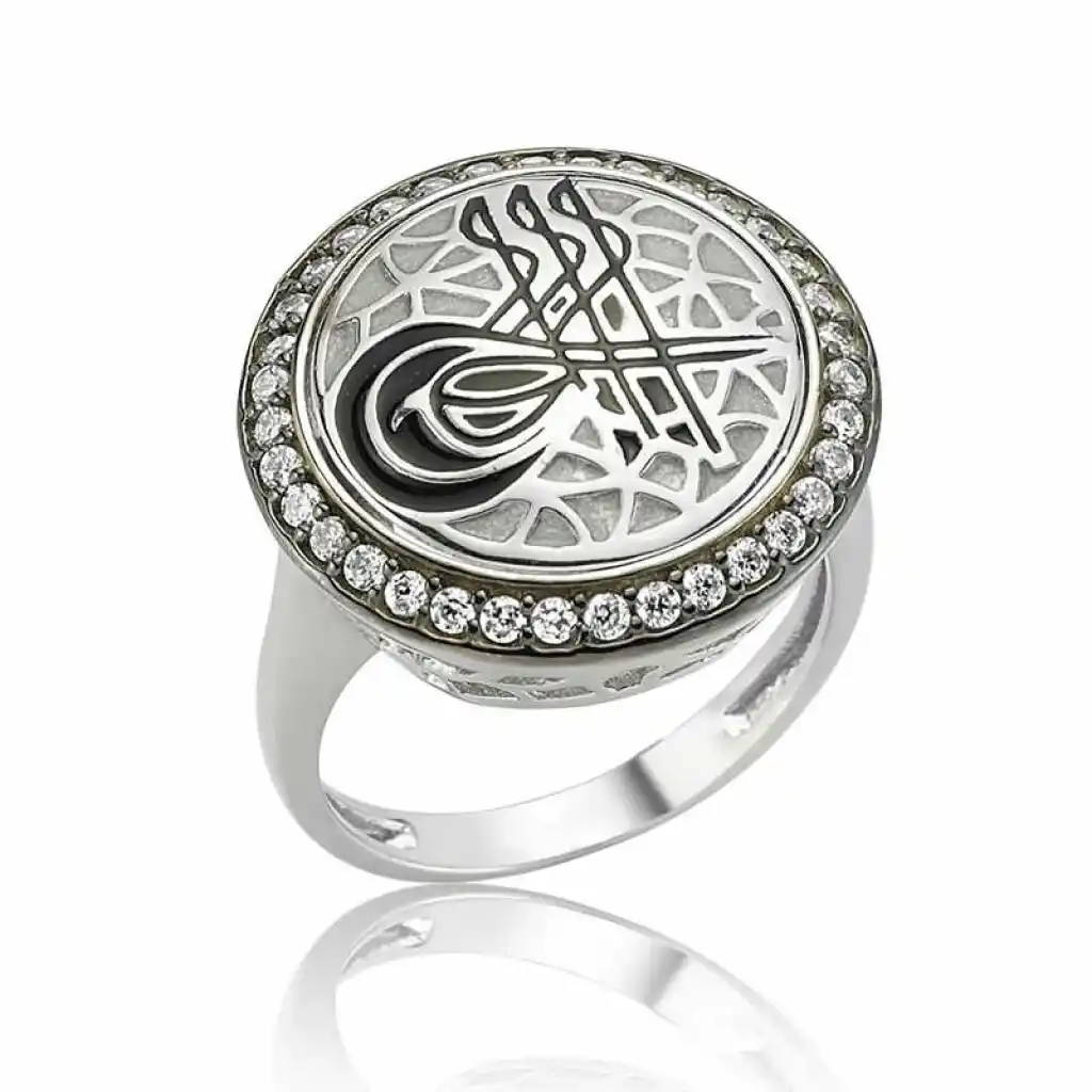 Tuğra, Osmanlı sultanlarının imzası anlamına gelir. Her tuğra; ona ait olan padişahın ismini, varlığını, hükümdarlığını ifade eder. Tuğra sembolü her padişaha göre farklı olmak üzere birçok şekilde günümüze ulaşmıştır. Tuğra Osmanlının her döneminde korunmuş, önemini hiç kaybetmemiştir. Ve zamanla hat sanatımızda da önemli bir yere sahip olup, günümüzde hattatlar tarafından sanatsal olarak yaşatılmaktadır. Gümüş tuğralı erkek yüzük 925 ayar gümüşten imal edilmiştir. 925 ayar gümüşten imal edilmiştir. Gümüş üzerine rodyum kaplama yapılmıştır. Rodyum kaplama yapılan gümüş yüzük modelleri parlaklığını uzun süre muhafaza eder, oksitlenmesi gecikir. Üzerinde bulunan taşlar zirkondur. Ürünlerimizin tamamı el emeği ile üretilmiştir. Gümüş ve değerli taşlar nedeniyle belirtilen ortalama ürün ağırlığında ± %10 sapma olabilmektedir.