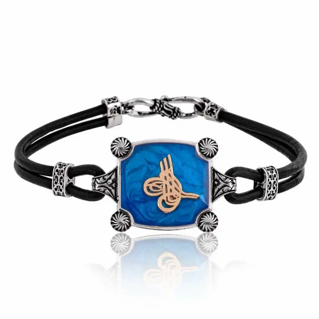 Osmanlı imparatorluğundaki padişahların imzası olarak da kullandığı tuğra sembolü kolye ile birleşerek anlamlı bir gümüş takı haline gelmiştir. Böylelikle sevdiklerinizi veya kendinizi derin bir anlama sahip olan bu kolye ile sevindirebilirsiniz. Tuğralı erkek bileklik modeli 925 ayar gümüş ve bronzdan imal edilmiştir. Gümüş üzerine oksit kaplama yapılmıştır. Oksit kaplama yapılan gümüş bileklik modelleri eskitme bir görünüme kavuşur. Bileklik üzerinde bulunan mavi renk soğuk mine tekniği ile yapılmıştır. Gümüş tuğralı erkek bileklik modeli diğer tüm gümüş erkek bileklik modellerinde olduğu gibi el emeği ile üretilmiştir. Gümüş ve değerli taşlar nedeniyle belirtilen ortalama ürün ağırlığında ± %10 sapma olabilmektedir.