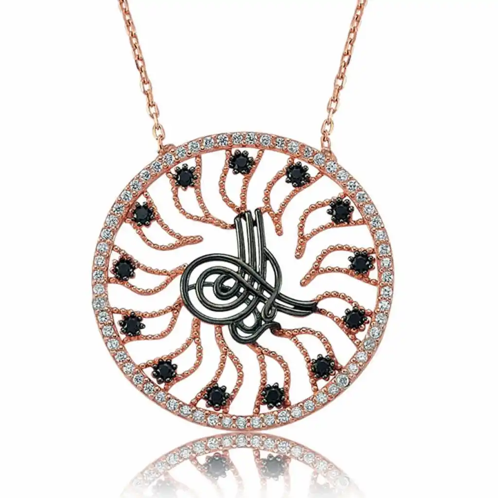 Gençlere ve kendisini genç hisseden tüm bayanlara; gümüş ve zirkonun ışıltısını bir araya getiren bu mükemmel tasarım tuğralı bayan kolye modeli 925 ayar gümüşten imal edilmiştir. Sizin olduğu kadar sevdiklerinizin de keyifle takacağı tuğralı kolye sevdiğinize verebileceğiniz en güzel hediyelerden biri olacaktır. Gümüş üzerinde rose altın kaplama yapılmıştır. Rose altın kaplama yapılan gümüş tuğralı bayan kolye modelleri parlaklığını uzun süre muhafaza eder. Tüm bayan kolye modellerinde olduğu gibi tuğralı gümüş kolye modelimiz de el emeği ile üretilmiştir. Gümüş ve değerli taşlar nedeniyle belirtilen ortalama ürün ağırlığında ± %10 sapma olabilmektedir.