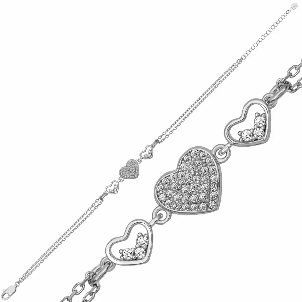 Romantik ve ışıltılı tasarımıyla öne çıkan Gümüş Üç Kalpli Kadın Bileklik, sevginin zarif bir yansımasıdır. Ortada yer alan zirkon taşlarla kaplı büyük kalp figürü göz alıcı bir parlaklık sunarken, iki yanında bulunan açık kalp detayları tasarıma modern ve dengeli bir görünüm kazandırır. 925 ayar gümüşten üretilen bileklik, kaliteli işçiliği ve parlak yüzeyi sayesinde uzun süre ışıltısını korur. İnce ve zarif zincir yapısı bilekte hafif ve konforlu bir kullanım sağlar. Günlük kombinlere şık bir dokunuş katarken, özel günlerde de romantik bir tamamlayıcı olarak tercih edilebilir. Sevgi, bağlılık ve zarafeti simgeleyen bu özel tasarım; doğum günü, yıl dönümü ve özel anlar için anlamlı bir hediye seçeneğidir. Gümüş ve değerli taşlar nedeniyle belirtilen ortalama ürün ağırlığında ± %10 sapma olabilmektedir.