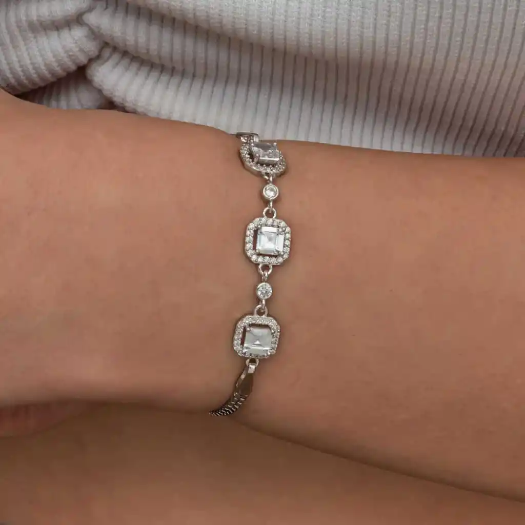 Üçlü kare kadın bileklik, şıklığı ve zarafeti bir araya getiren bir aksesuar türüdür.Bu bileklikler, günlük kullanımdan özel davetlere kadar farklı ortamlarda rahatlıkla tercih edilebilir.Hem tek başına hem de diğer takılarla kombinlenerek şık bir görünüm oluşturabilir.Gümüş üzerine rodyum kaplama yapılmıştır. Rodyum kaplama yapılan zirkon taşlı kare kadın bileklik modelleri parlaklığını uzun süre muhafaza eder. Gümüş ve değerli taşlar nedeniyle belirtilen ortalama ürün ağırlığında ± %10 sapma olabilmektedir.