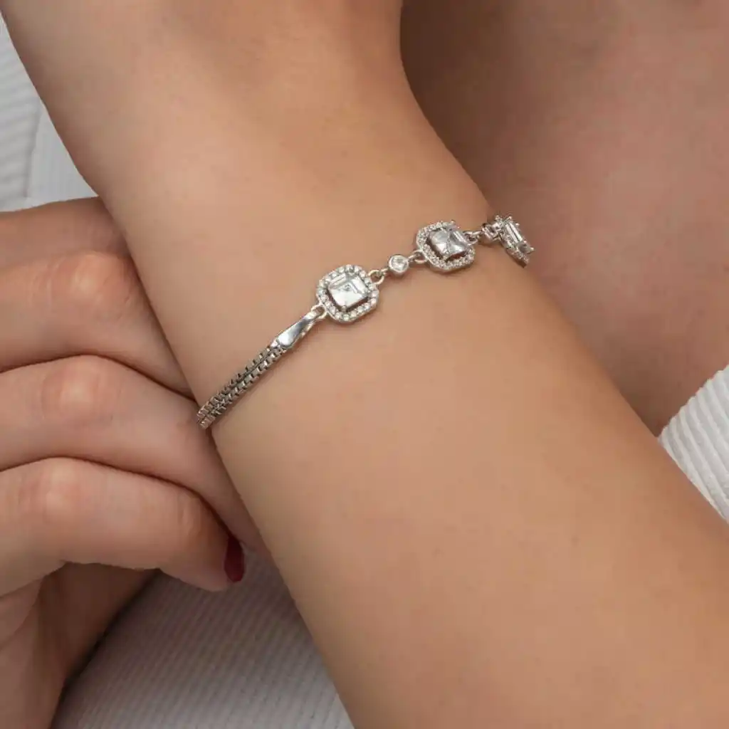 Üçlü kare kadın bileklik, şıklığı ve zarafeti bir araya getiren bir aksesuar türüdür.Bu bileklikler, günlük kullanımdan özel davetlere kadar farklı ortamlarda rahatlıkla tercih edilebilir.Hem tek başına hem de diğer takılarla kombinlenerek şık bir görünüm oluşturabilir.Gümüş üzerine rodyum kaplama yapılmıştır. Rodyum kaplama yapılan zirkon taşlı kare kadın bileklik modelleri parlaklığını uzun süre muhafaza eder. Gümüş ve değerli taşlar nedeniyle belirtilen ortalama ürün ağırlığında ± %10 sapma olabilmektedir.