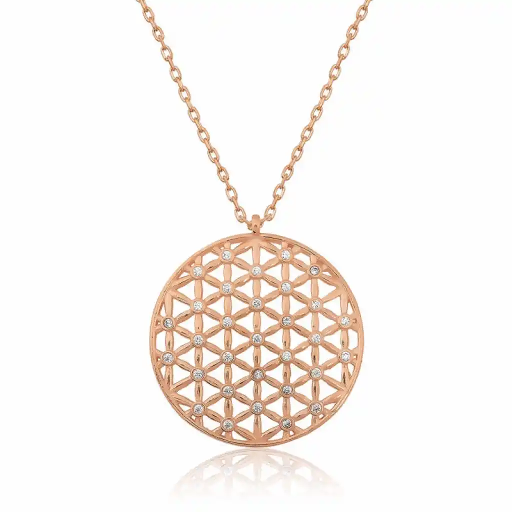 Yaşam çiçeği, iç içe geçmiş eşit alana sahip çok sayıda çember ve dışında büyük bir çemberden oluşan geometrik şekilden oluşmaktadır. Her bir çemberin merkezi, çevresindeki çemberin çevrelerinin kesiştiği yerdedir. Drunvalo Melchizedek bu sembolün evrenin ve yaşamın sırlarını barındırdığını iddia etmektedir. Günün her anında severek kullanabileceğiniz hoş bir aksesuardır. Gümüş yaşam çiçeği bayan kolye 925 ayar gümüşten imal edilmiştir. Bu kolye üzerine rose kaplama yapılmıştır.Rose kaplama yapılan ürünler parlaklığını uzun süre muhafaza eder ve gümüşü bakır rengine dönüştürür. Tüm gümüş bayan kolye modellerinde olduğu gibi gümüş yaşam çiçeği bayan kolye modeli de el emeği ile üretilmiştir. Gümüş ve değerli taşlar nedeniyle belirtilen ortalama ürün ağırlığında ± %10 sapma olabilmektedir. Ürünlerimizin tamamı el emeği ile üretilmiştir.