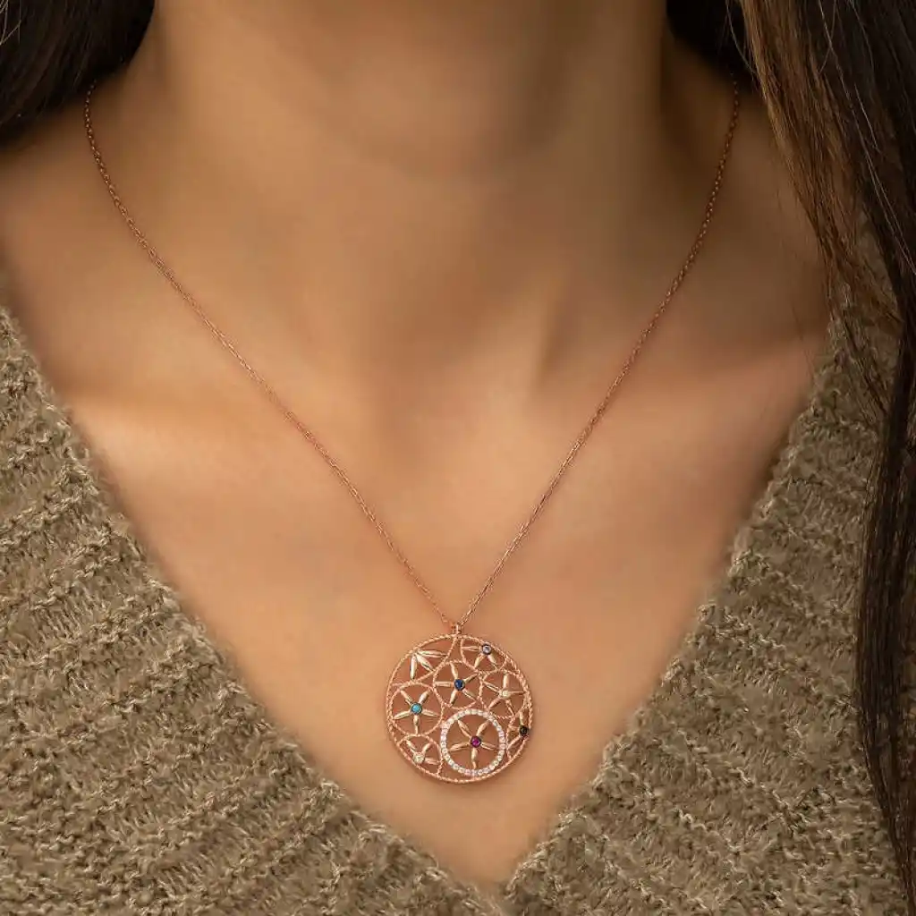 Yaşam çiçeği, iç içe geçmiş eşit alana sahip çok sayıda çember ve dışında büyük bir çemberden oluşan geometrik şekilden oluşmaktadır. Her bir çemberin merkezi, çevresindeki çemberin çevrelerinin kesiştiği yerdedir. Drunvalo Melchizedek bu sembolün evrenin ve yaşamın sırlarını barındırdığını iddia etmektedir. Günün her anında severek kullanabileceğiniz hoş bir aksesuardır. Gümüş yaşam çiçeği bayan kolye 925 ayar gümüşten imal edilmiştir. Bu kolye üzerine rose kaplama yapılmıştır.Rose kaplama yapılan ürünler parlaklığını uzun süre muhafaza eder ve gümüşü bakır rengine dönüştürür. Tüm gümüş bayan kolye modellerinde olduğu gibi gümüş yaşam çiçeği bayan kolye modeli de el emeği ile üretilmiştir. Gümüş ve değerli taşlar nedeniyle belirtilen ortalama ürün ağırlığında ± %10 sapma olabilmektedir. Ürünlerimizin tamamı el emeği ile üretilmiştir.