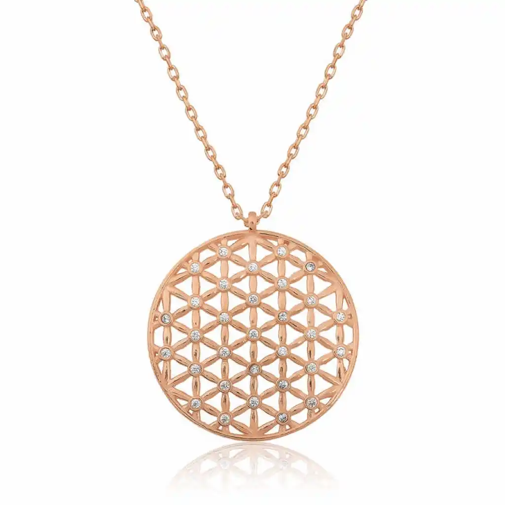 Yaşam çiçeği, iç içe geçmiş eşit alana sahip çok sayıda çember ve dışında büyük bir çemberden oluşan geometrik şekilden oluşmaktadır. Her bir çemberin merkezi, çevresindeki çemberin çevrelerinin kesiştiği yerdedir. Drunvalo Melchizedek bu sembolün evrenin ve yaşamın sırlarını barındırdığını iddia etmektedir. Günün her anında severek kullanabileceğiniz hoş bir aksesuardır. Gümüş yaşam çiçeği bayan kolye 925 ayar gümüşten imal edilmiştir. Bu kolye üzerine rose kaplama yapılmıştır.Rose kaplama yapılan ürünler parlaklığını uzun süre muhafaza eder ve gümüşü bakır rengine dönüştürür. Tüm gümüş bayan kolye modellerinde olduğu gibi gümüş yaşam çiçeği bayan kolye modeli de el emeği ile üretilmiştir. Gümüş ve değerli taşlar nedeniyle belirtilen ortalama ürün ağırlığında ± %10 sapma olabilmektedir. Ürünlerimizin tamamı el emeği ile üretilmiştir.
