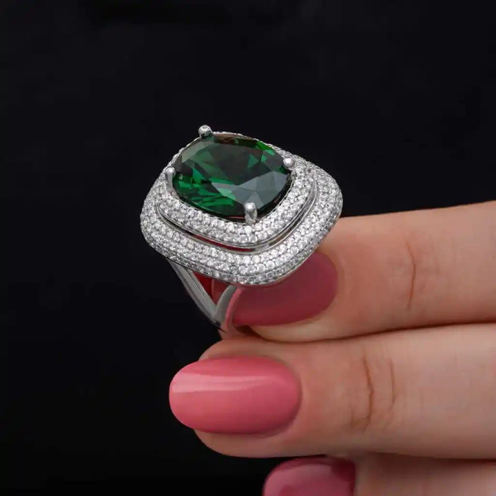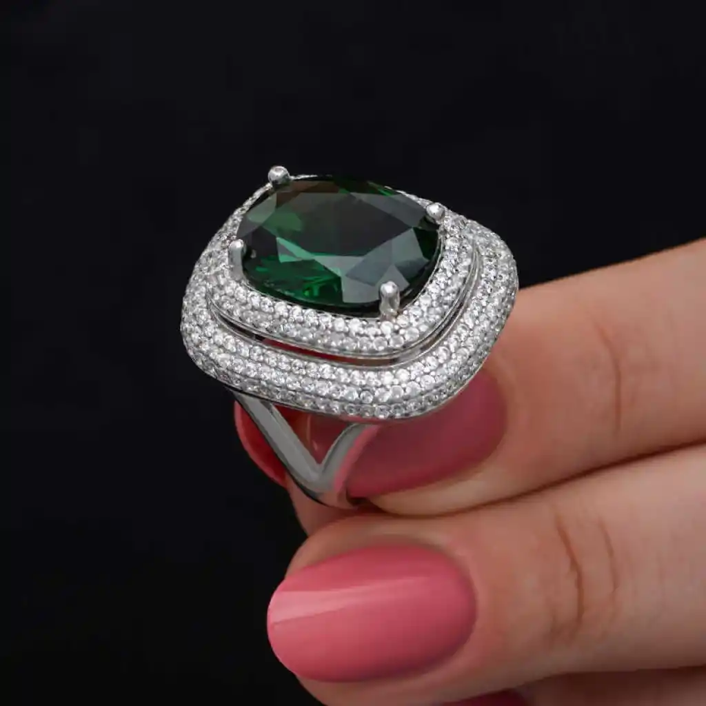 Yüzyıllardır imajınızın simgesi olan takılar, birbirinden özel tasarım koleksiyonlarda sizlerle buluşuyor. Günlük hayatınızdan özel günlerinize kadar her anınızda yanınızda olan gümüş yüzük modelleriyle sizlerde tarzınızı yansıtın. Bu birbirinden farklı dikkat çekici tasarımlar sayesinde ruhunuza hitap eden yaratıcı özgünlüğü ortaya koymaya başlayın. Hayalinizdeki kombinleri gerçeğe dönüştürebileceğiniz gümüş yüzük çeşitleri ile girdiğiniz her ortamda ilgi çekici stiliniz ile ön plana çıkmak artık çok kolay... Yeşil zirkon taşlı kadın yüzük 925 ayar gümüşten imal edilmiştir, üzerine rodyum kaplama yapılmıştır. Gümüş yüzük modellerimizin tamamı el emeği ile üretilmiştir. Gümüş ve değerli taşlar nedeniyle belirtilen ortalama ürün ağırlığında ± %10 sapma olabilmektedir.