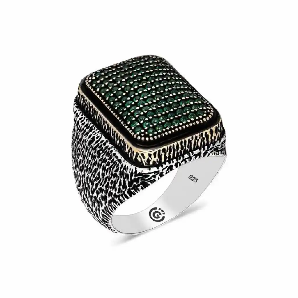 Gümüş Yeşil Zirkon Taşlı Kare Erkek Yüzük