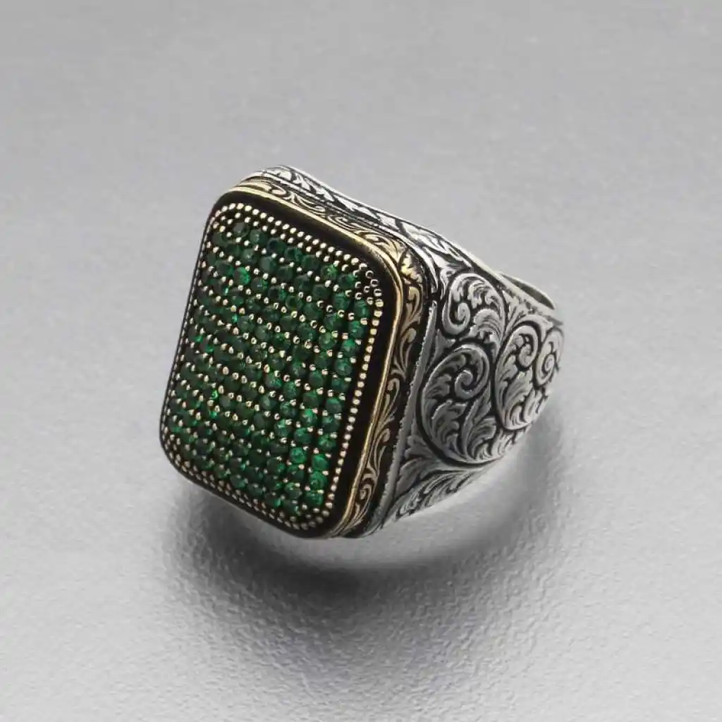Gümüş Yeşil Zirkon Taşlı Kare Erkek Yüzük