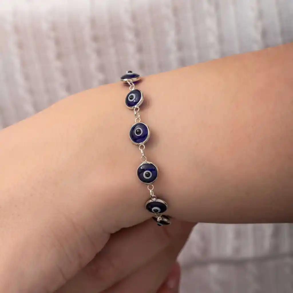 Nazar boncuğunu insanlar uzun yıllardan beri kötü bakıştan korunmak için kullanmışlardır. Kötü bakışların insanlar üzerinde olumsuz etki oluşturmasına karşı bir önlemdir nazar boncuğu… Bu sebeptendir ki insanlar sevdiklerini korumak için nazar boncuğu takmaktadır. Bu nazar bileklik de şıklığı ve zarafeti yansıtıyor. Her dönem sevilen ve şıklığından ödün vermeyen bu modeli ; doğum günü hediyesi, sevgililer günü hediyesi veya annelere hediye olarak özel günlerde tercih edebilirsiniz. Gümüş nazar kadın bileklik, 925 ayar gümüşten imal edilmiştir. Gümüş üzerine rodyum kaplama yapılmıştır. Rodyum kaplama yapılan gümüş kadın bileklikler parlaklığını uzun süre muhafaza eder, oksitlenmesi gecikir. Tüm gümüş kadın bilekliklerinde olduğu gibi bu gümüş nazar kadın bileklik modeli de tamamı el emeği ile üretilmiştir. Gümüş ve değerli taşlar nedeniyle belirtilen ortalama ürün ağırlığında ± %10 sapma olabilmektedir.