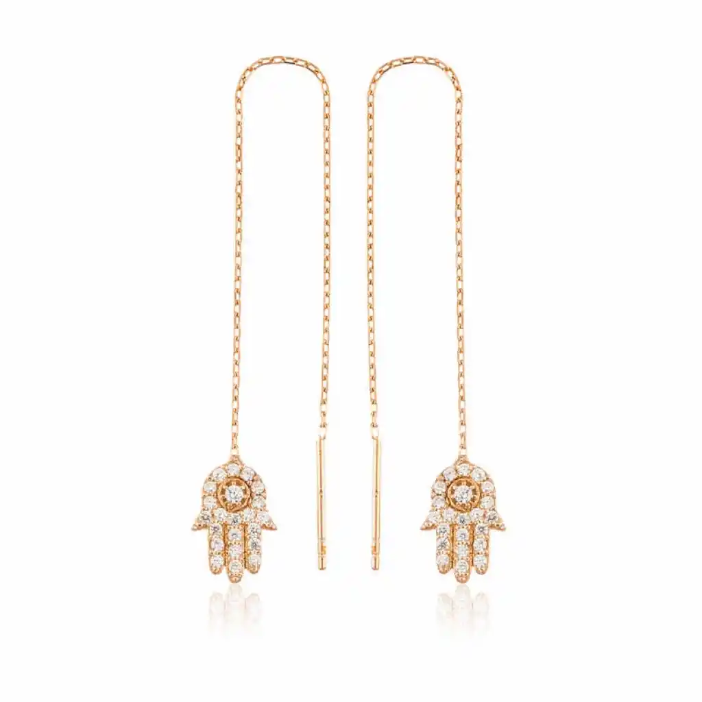 Her ne kadar Hz. Fatma"nın eli olarak bilinse de arapçada “hamse” diye anılır. Hamse, beş anlamına gelir ve bir elin parmak sayısını gösterir. Hz. Fatma bir gün mutfakta helva kavururken, eşi Hz. Ali görür ve pişen helvaya elini daldırır ancak hiçbir şey olmaz, helvayı böyle kavurmayı devam eder. O günden sonra elinin kutsallığına, gücüne adeta yenilmezliğine inanılır. Her güçlük adeta onun eliyle aşılacaktır. Bu eşsiz küpe; doğum günü hediyesi, sevgililer günü hediyesi veya annelere hediye olarak özel günlerde tercih edilebilecek mükemmel bir seçenektir. Bu harika tasarım Fatma eli bayan bayan küpe; 925 ayar gümüşten imal edilmiştir. Gümüş üzerine rose kaplama yapılmıştır. Rose altın kaplama yapılan tüm gümüş küpe modelleri parlaklığını uzun süre muhafaza eder, gümüşü pembe rengine çevirir, oksitlenmeyi geciktirir Küpe üzerinde bulunan beyaz taşlar zirkondur. Tüm gümüş bayan küpelerde olduğu gibi zincirli Fatma eli bayan küpe de el emeği ile üretilmiştir. Gümüş ve değerli taşlar nedeniyle belirtilen ürün ağırlığında ± %10 sapma olabilmektedir.