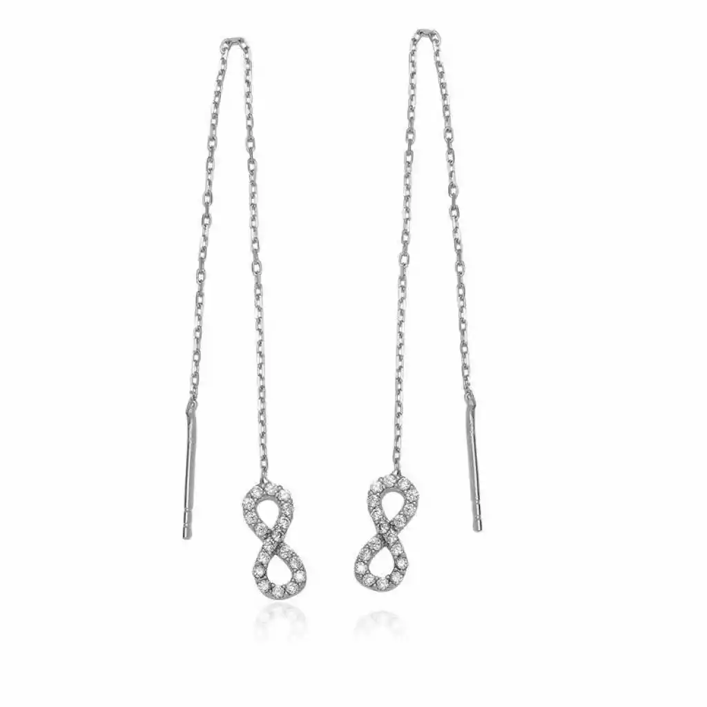 Sevgilinize sonsuz aşkı ifade etmenin en güzel ve en anlamlı yollarından biri sonsuzluk küpesidir. Şık tasarımıyla bu özel küpe ile sevdiğinize olan sonsuz aşkınızı ifade edebilir, sonsuza kadar birlikte olacağınız mesajı verebilirsiniz. Her dönem sevilen bu sade ve şık küpeyi; doğum günü hediyesi, sevgililer günü hediyesi veya annelere hediye olarak özel günlerde tercih edebilirsiniz. Zincirli sonsuzluk bayan küpe, 925 ayar gümüşten imal edilmiştir. Gümüş küpe üzerine rodyum kaplama yapılmıştır. Rodyum kaplama yapılan bayan küpeler parlaklığını uzun süre muhafaza eder ve oksitlenmeyi geciktirir. Tüm gümüş bayan küpelerinde olduğu gibi bu gümüş zincirli sonsuzluk bayan küpe de tamamı el emeği ile üretilmiştir. Gümüş ve değerli taşlar nedeniyle belirtilen ortalama ürün ağırlığında ± %10 sapma olabilmektedir.