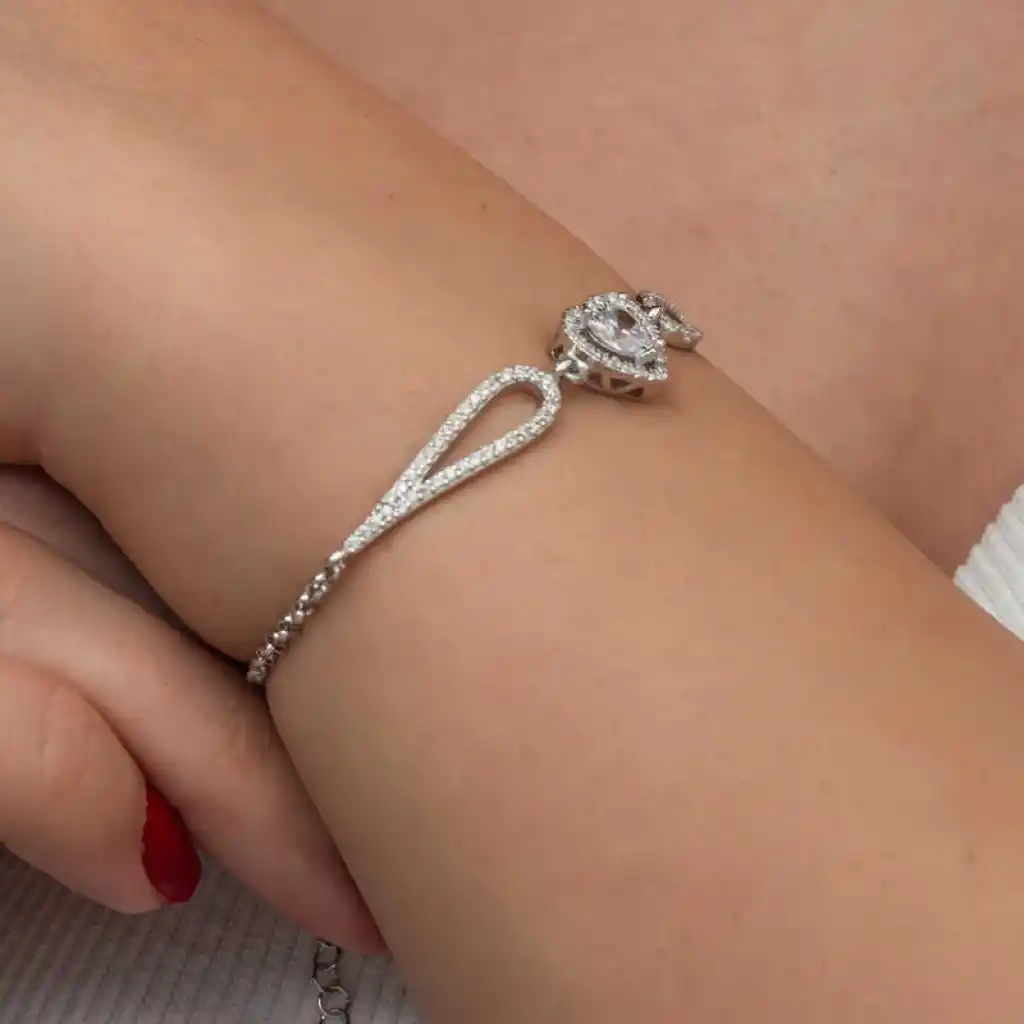 Zirkon taşlı kalp bileklik, şıklığı ve zarafeti bir araya getiren özel bir takı parçasıdır.Zirkon taşları, parlak ve ışıltılı yapısıyla bilekliği daha göz alıcı hale getirirken, kalp şekli de aşkı ve bağlılığı simgeler.Gümüş üzerine rodyum kaplama yapılmıştır. Rodyum kaplama yapılan kalp bileklik parlaklığını uzun süre muhafaza eder ve oksitlenmesi gecikir. Tüm kadın bilekliklerde olduğu gibi gümüş kalp kadın bileklik de el emeği ile üretilmiştir. Gümüş ve değerli taşlar nedeniyle belirtilen ortalama ürün ağırlığında ± %10 sapma olabilmektedir.