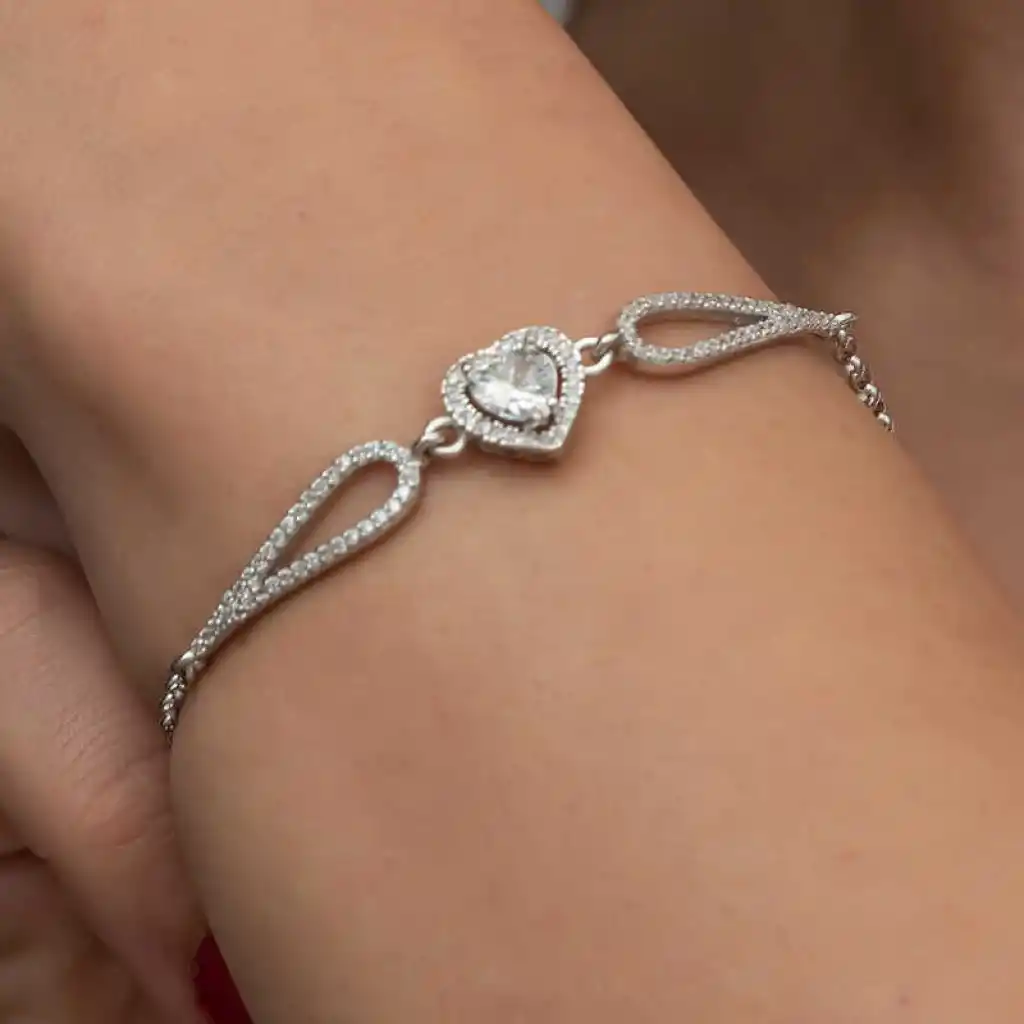 Zirkon taşlı kalp bileklik, şıklığı ve zarafeti bir araya getiren özel bir takı parçasıdır.Zirkon taşları, parlak ve ışıltılı yapısıyla bilekliği daha göz alıcı hale getirirken, kalp şekli de aşkı ve bağlılığı simgeler.Gümüş üzerine rodyum kaplama yapılmıştır. Rodyum kaplama yapılan kalp bileklik parlaklığını uzun süre muhafaza eder ve oksitlenmesi gecikir. Tüm kadın bilekliklerde olduğu gibi gümüş kalp kadın bileklik de el emeği ile üretilmiştir. Gümüş ve değerli taşlar nedeniyle belirtilen ortalama ürün ağırlığında ± %10 sapma olabilmektedir.