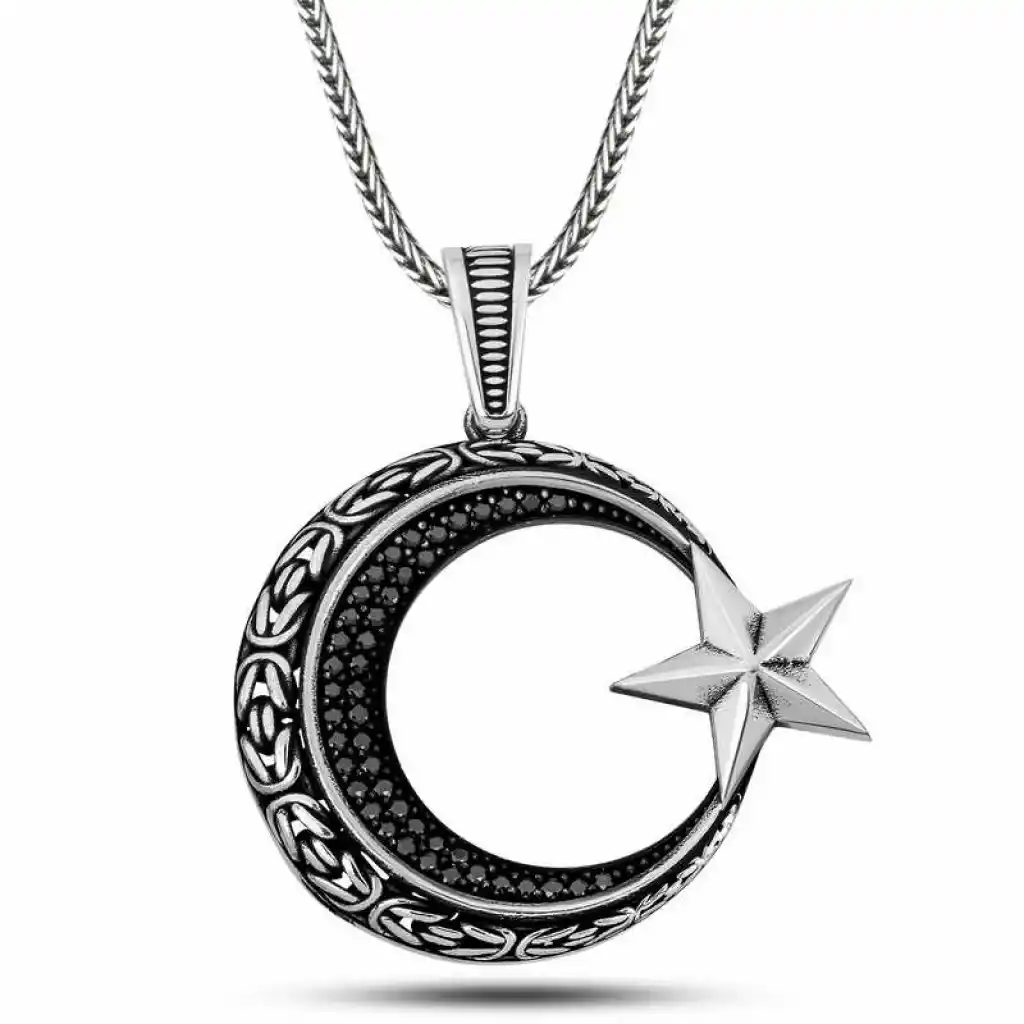 Gümüş Zirkon Taşlı Motifli Ay Yıldız Erkek Kolye