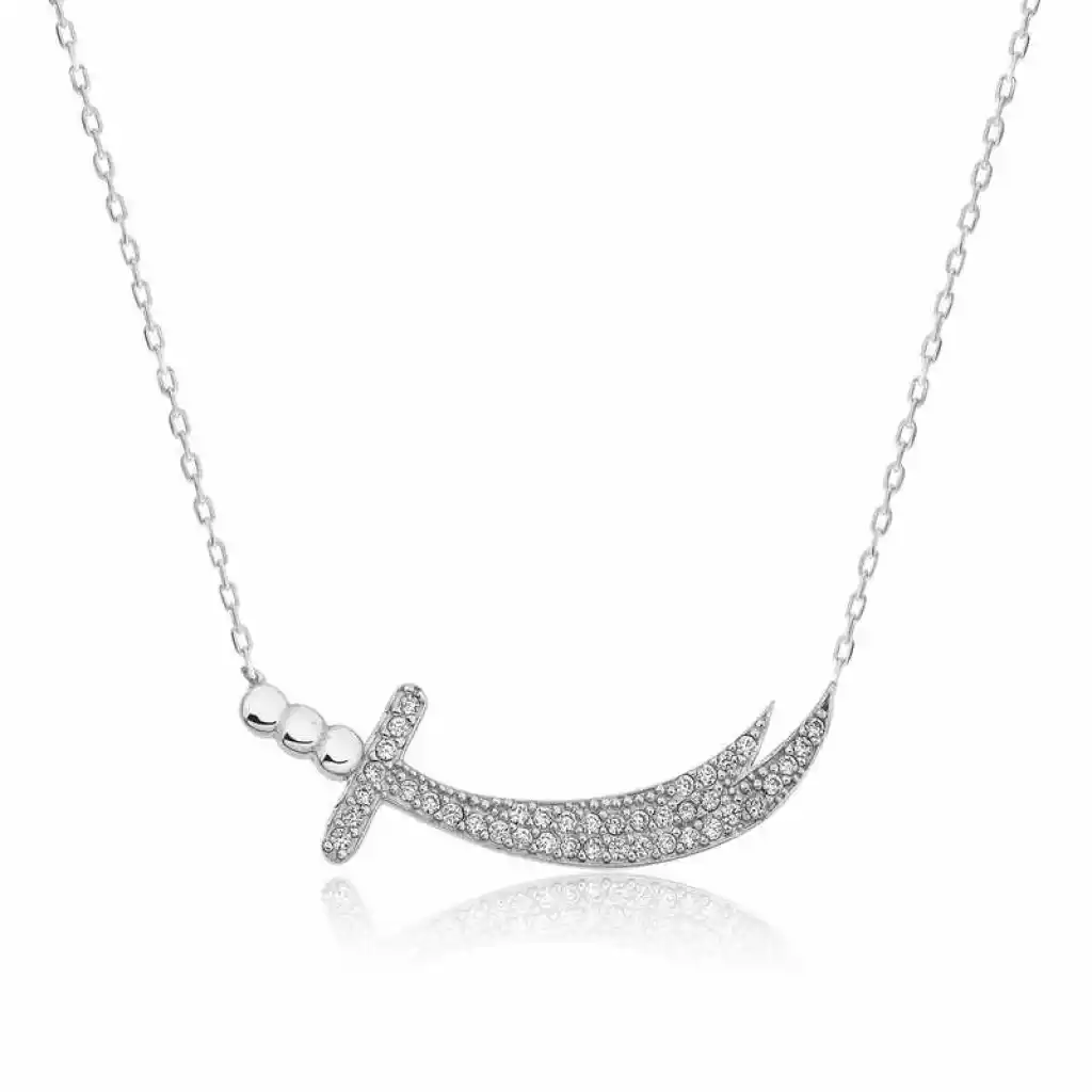 Tarihçilere göre Mısır Melik"i Mukavkas bu kılıcı Hz. Muhammed"e hediye etmiştir. Amrû bin Adûd, savaşta kendisine karşı çıkacak bir savaşçı istediğinde Peygamber, Ali"ye bu kılıcı uzatarak onun karşısına çıkmasına izin vermiştir. Hz. Ali"nin Uhud savaşında Kureyş’in önde gelen savaşçılarından dokuz kişiyi öldürdüğü, bu savaşta bedeninden yetmiş yara alarak son ana kadar Hz. Muhammed"i savunduğu, bu sebeple de Cebrail"in, “Zülfikar"dan keskin kılıç, Ali’den büyük yiğit yoktur.” "Lâ fetâ illâ Ali, lâ seyfe illâ Zülfikâr" dediği rivayet edilir. Ali"nin vasiyeti üzerine Necef"te denize atıldığı belirtilmiştir. Zülfikar kılıcı kadın kolye modeli 925 ayar gümüşten imal edilmiştir. Gümüş üzerine rodyum kaplama yapılmıştır. Rodyum kaplama yapılan gümüş kadın kolye modelleri parlaklığını uzun süre muhafaza eder. Ürünlerimizin tamamında olduğu gibi gümüş zülfikar kılıcı kadın kolye modeli de el emeği ile üretilmiştir. Gümüş ve değerli taşlar nedeniyle beliritlen ortalama ürün ağırlığında ± %10 sapma olabilmektedir.
