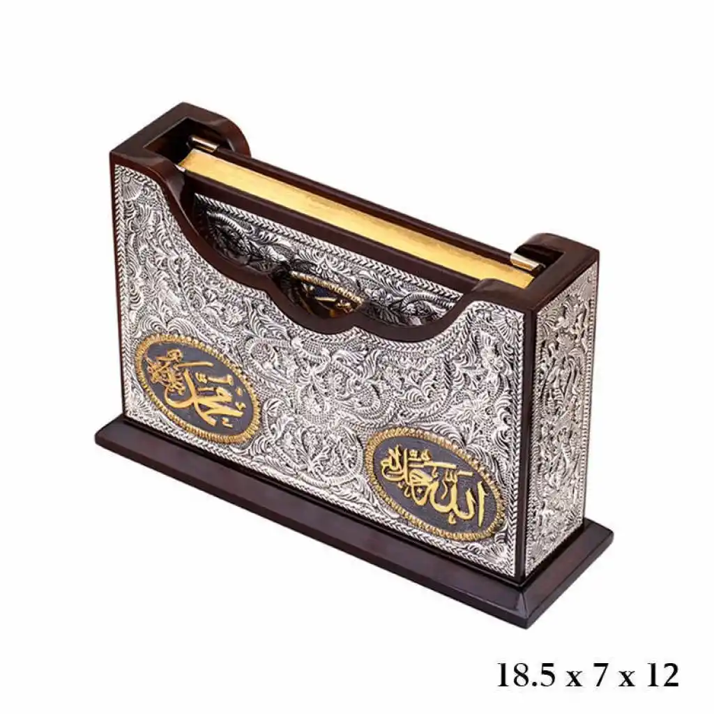 Bu ürün Kur"an-ı Kerim ve kabı olmak üzere iki parçadan oluşmaktadır. Hem evinize, hem sevdiklerinize manevi değeri yüksek çok özel bir hediye seçeneğidir. Kur"an-ı Kerim ve kabı ceviz rengi ahşap üzerine 925 ayar gümüş işlemelerle süslenmiştir. Altın rengi olan kısımlar gümüş üzeri altın kaplamadır. Bu şık ve çok özel ürün tamamen el emeği ile üretilmiştir.