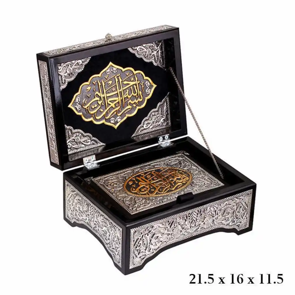 Bu ürün Kur"an-ı Kerim ve kapaklı sandık olmak üzere iki parçadan oluşmaktadır. Hem evinize, hem sevdiklerinize manevi değeri yüksek çok özel bir hediye seçeneğidir. Kur"an-ı Kerim ve Kuran Sandığı ceviz rengi ahşap üzerine 925 ayar gümüş işlemelerle süslenmiştir. Altın rengi olan kısımlar gümüş üzeri altın kaplamadır. Bu şık ve çok özel ürün tamamen el emeği ile üretilmiştir.