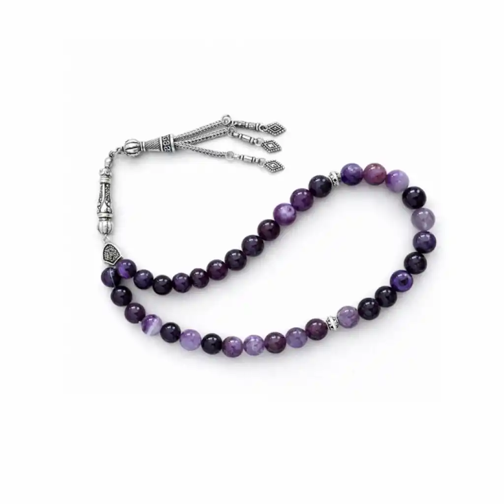 Doğal mor akik taşlardan üretilmiş, el işçiliğiyle hazırlanmış tesbih. Her taşın kendine özgü renk geçişleriyle zarif bir görünüm sunar.